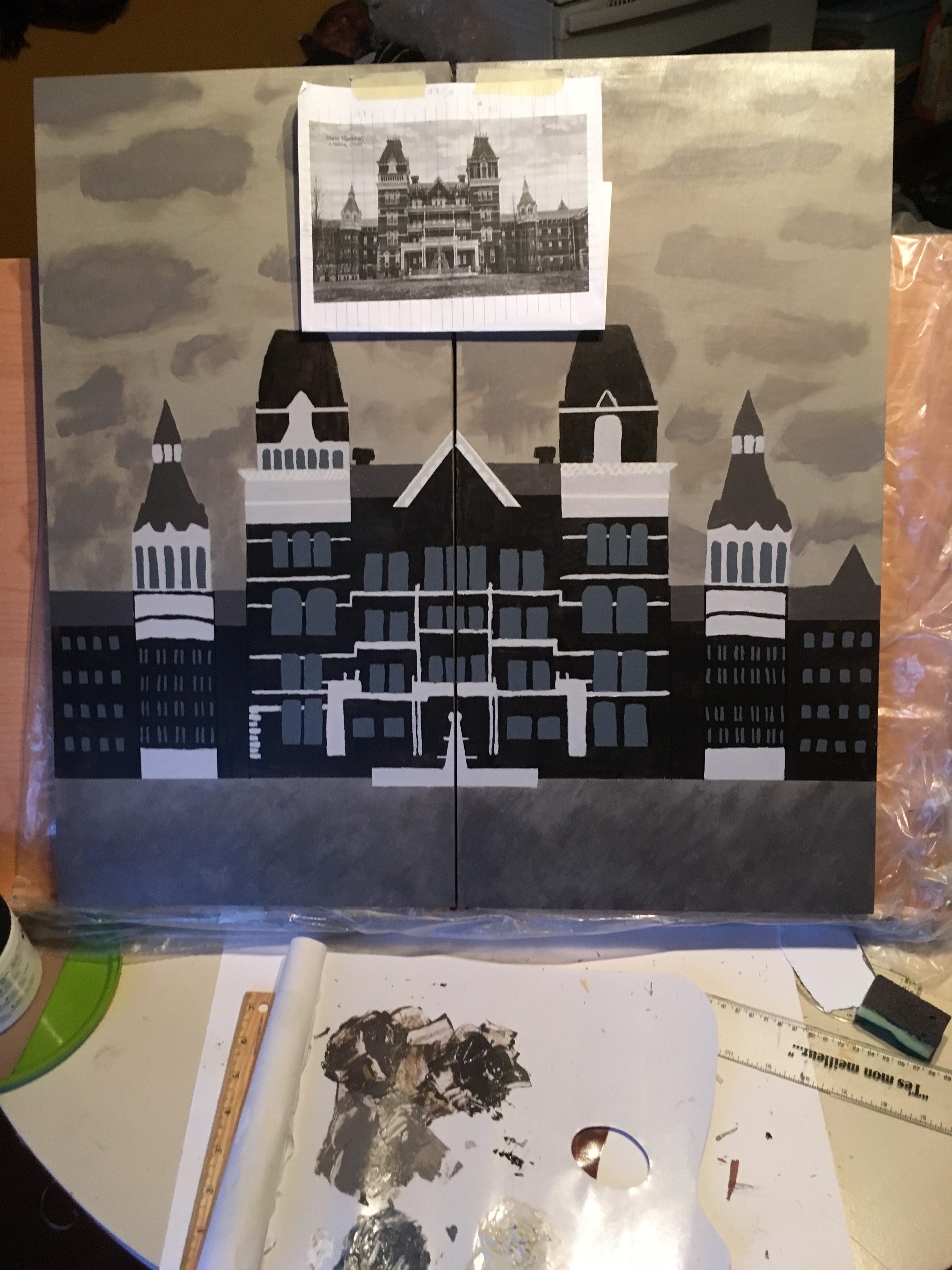 Au lieu de faire l’histoire de la folie, j’ai décidé de représenter plutôt le vide et l’abandon qui caractérisent aujourd’hui ces lieux de soins pour la construction desquels une fortune a été dépensée, mais qui ne sont pour une bonne partie plus du tout habités par des patients. J’ai donc choisi dans le livre des photos de pièces qui me permettraient de créer l’intérieur d’un hôpital. L’extérieur est inspiré d’une carte postale de l’hôpital d’Athens en Ohio. La voici :