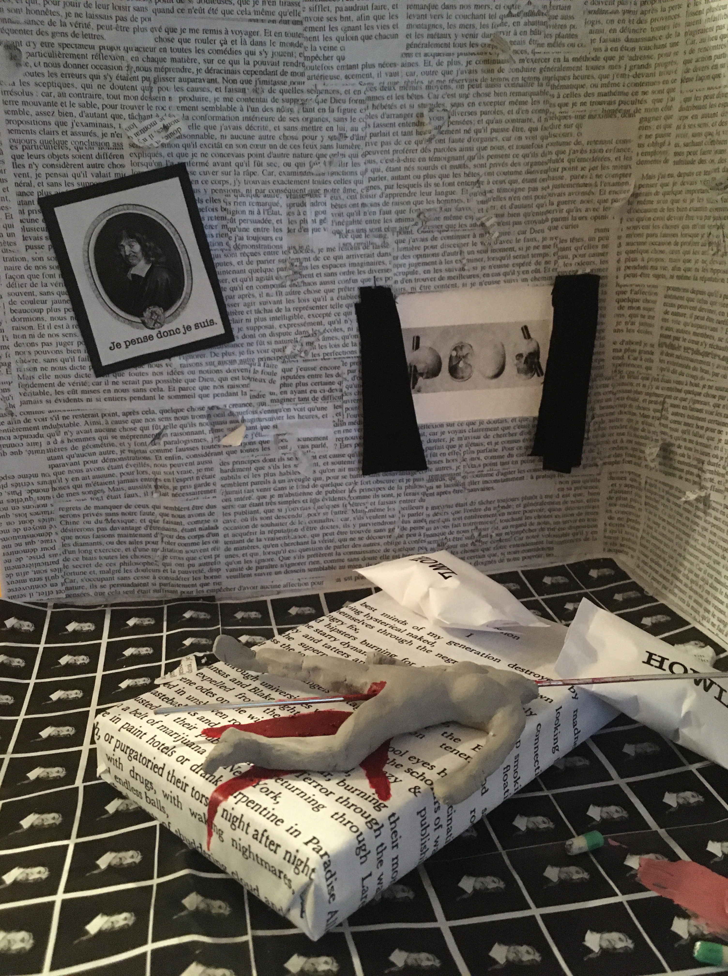 Le texte est collé en morceau de la première à la dernière page, les unes par-dessus les autres. En en faisant les murs, j’ai voulu montrer comment nous avons été complètement enveloppés longtemps par les idées véhiculées dans ce livre. Cet enveloppement qui m’a aidée au départ, est devenu ensuite très nocif pour ma vie. Cette conception nuit aussi à tout le monde, entre autres en créant une conception très toxique de ce que doit être la masculinité qui est encore malheureusement enseignée/imposée à trop d’hommes. J’ai utilisé la répétition du portrait de Descartes à la fois pour suggérer un parquet, mais aussi pour montrer l’omniprésence de ses idées dans la culture et dans la vie encore aujourd’hui. Ce pourquoi j’ai agressé le texte en le découpant en morceaux et je l’ai ensuite perforé et déchiré, en laissant des morceaux sur le sol. Les deux cadres sur les murs sont simplement des rappels de citations importantes de deux des trois textes présents dans le projet.