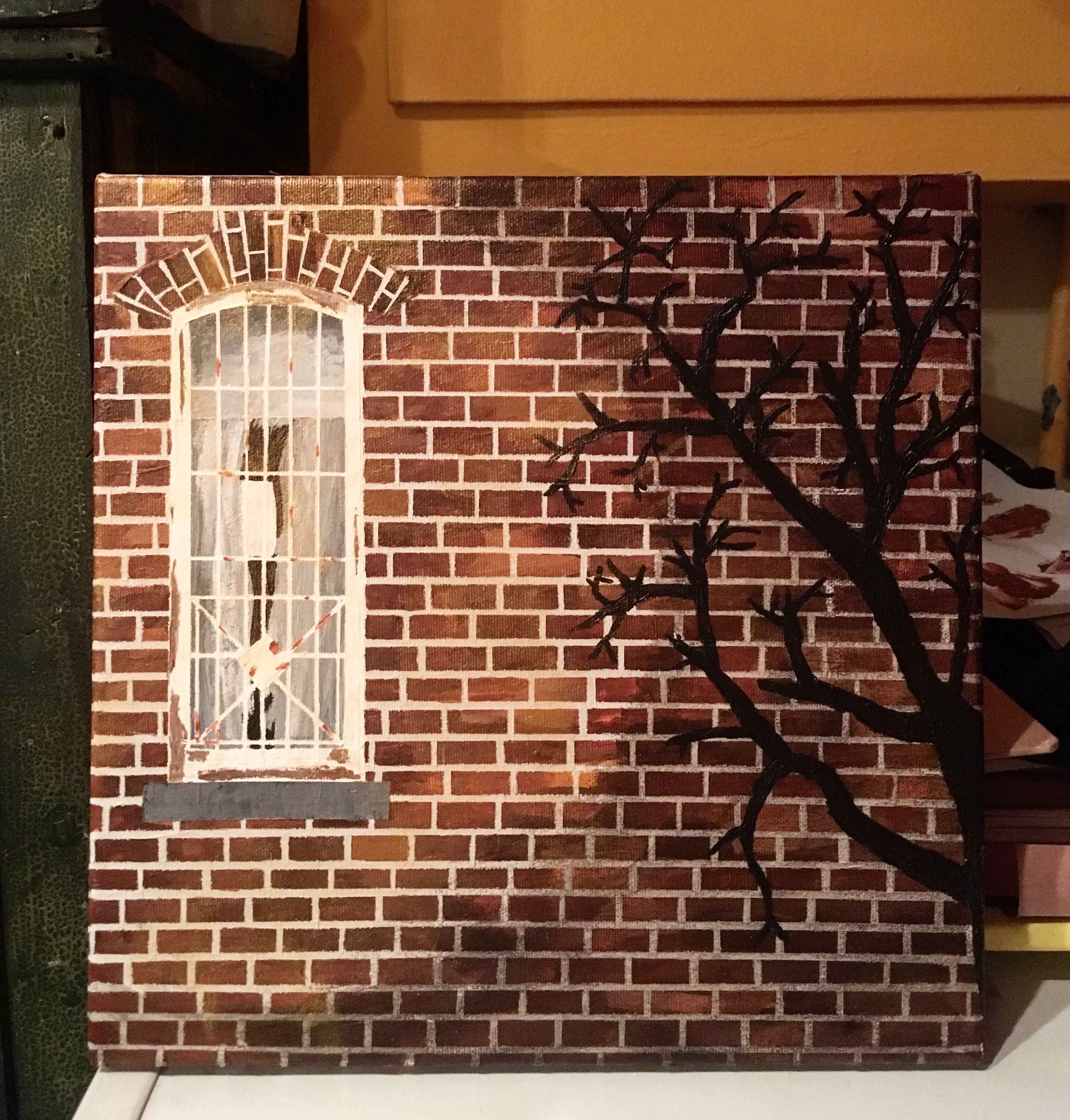 J’ai choisi le sujet de la toile en fonction de mes intérêts. Je m’intéresse beaucoup à la solitude et à l’enfermement. J’ai aussi travaillé sur les écrivaines qui ont été internées pour mon doctorat et cela m’a fait me pencher sur l’architecture asilaire, particulièrement l’architecture du plan Kirkbride, un projet architectural qui visait en partie à soigner les patients en utilisant un environnement magnifique où ils seraient plus aptes à s’épanouir. En mélangeant mes intérêts et mes préoccupations, j’ai décidé de peindre une fenêtre d’un hôpital que j’avais trouvée magnifique. Cela représentait pour moi un défi technique, à la fois sur le plan de la précision, mais aussi la suggestion de textures. Je peins pour le moment de façon assez réaliste, même si pas toujours. Je suis en cours d’exploration. Je ne sais pas ce que je ferai sur le long terme. J’aime la peinture abstraite, mais ce n’est pas ce que j’ai envie de faire pour le moment. J’ai besoin de quelque chose de plus organique, de quelque chose qui raconte plus clairement une histoire aussi… ce qui explique en partie mes choix. J’ai eu ensuite différentes idées, que vous pouvez voir sur la photo, afin de rendre la composition un peu plus intéressante qu’une simple fenêtre sur un mur de briques.