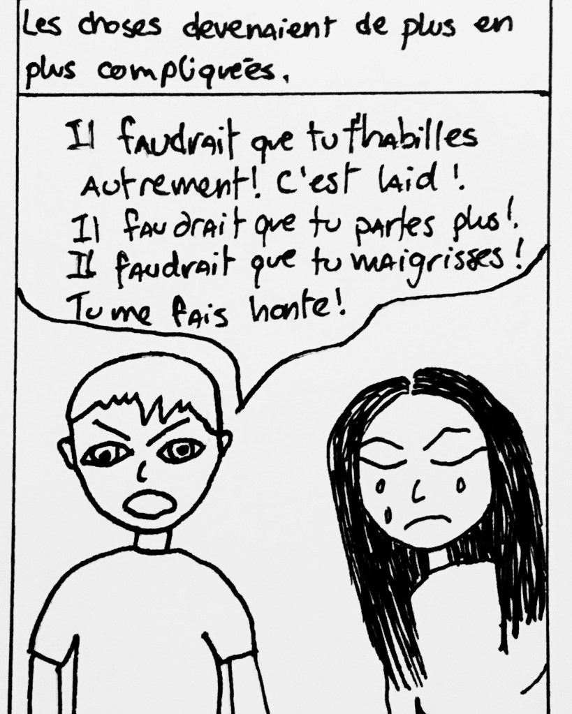 Sur le coup ça m’a fait un choc, qu’il soit si différent de comment il avait d’abord semblé être… mais je me suis vite ressaisie parce que j’ai l’habitude. Ils sont comme ça, les violents. Ils ont deux visages. Ils sont gentils avant de montrer l’autre. C’est évident : si les agresseurs n’étaient pas charmants, tout le monde se sauverait en courant et il n’y en aurait pas de problème. Personne ne se ferait attraper. Personne ne se ferait agresser. Il me semble que ce n’est pas difficile à comprendre… mais pour certains, il semble que oui… mais j’y reviendrai.