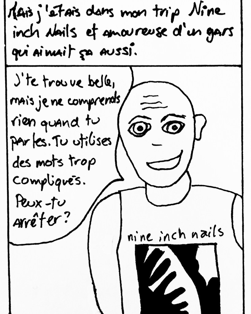 Quand j’ai atteint l’adolescence, j’étais encore là à penser que j’étais stupide quand les jeunes hommes que je fréquentais se sont mis à m’agresser psychologiquement parce que j’étais intelligente et que c’était insupportable pour eux. Ça ne s’est jamais arrêté. Parfois, encore aujourd’hui, des amis voulant bien faire me disent que je devrais cacher mon intelligence pour être en couple plus facilement. Je ne suis pas fâchée contre eux. Je pense qu’ils sont inquiets et cherchent des solution. J’ai fait ça quand j’étais plus jeune, essayer de cacher mon intelligence pour être acceptée. Parce que même si je me sentais stupide, les gens me disaient encore que j’étais trop intelligente. J’ai commencé à boire dans les partys… puis ça a dégénéré jusqu’à ce que je prenne des drogues par intraveineuse à l’âge de 14 ans, drogues vendues par le gars dans le dessin qui en plus de n’avoir aucun scrupule à vendre des drogues dures à des filles de 14 ans, s’était aussi permis de me demander d’arrêter d’utiliser des mots compliqués parce que ça me rendait moins intéressante même s’il me trouvait belle puisqu’il ne comprenait rien quand je parlais. je ne dis pas ces choses pour me vanter. C’est juste un fait. c’est comme ça. Je suis née comme ça, avec ce cerveau là. Je ne peux pas le couper pour faire plaisir aux autres.