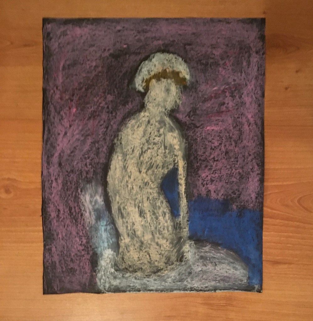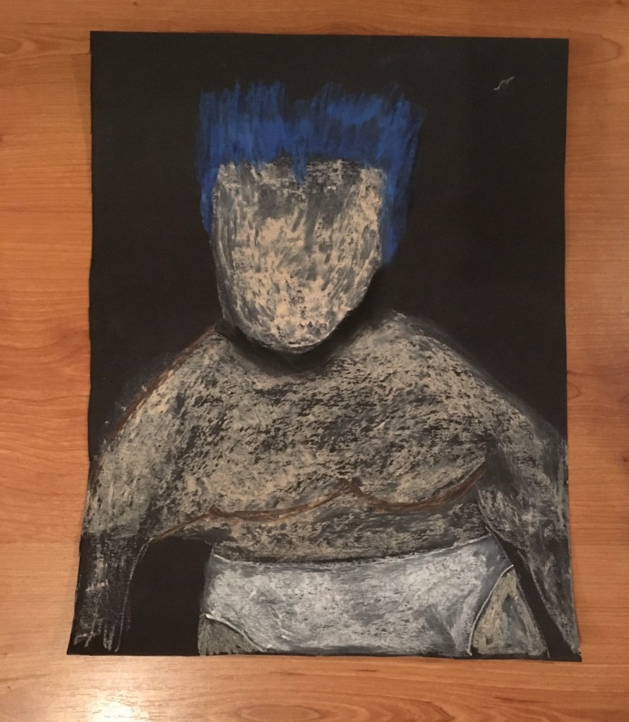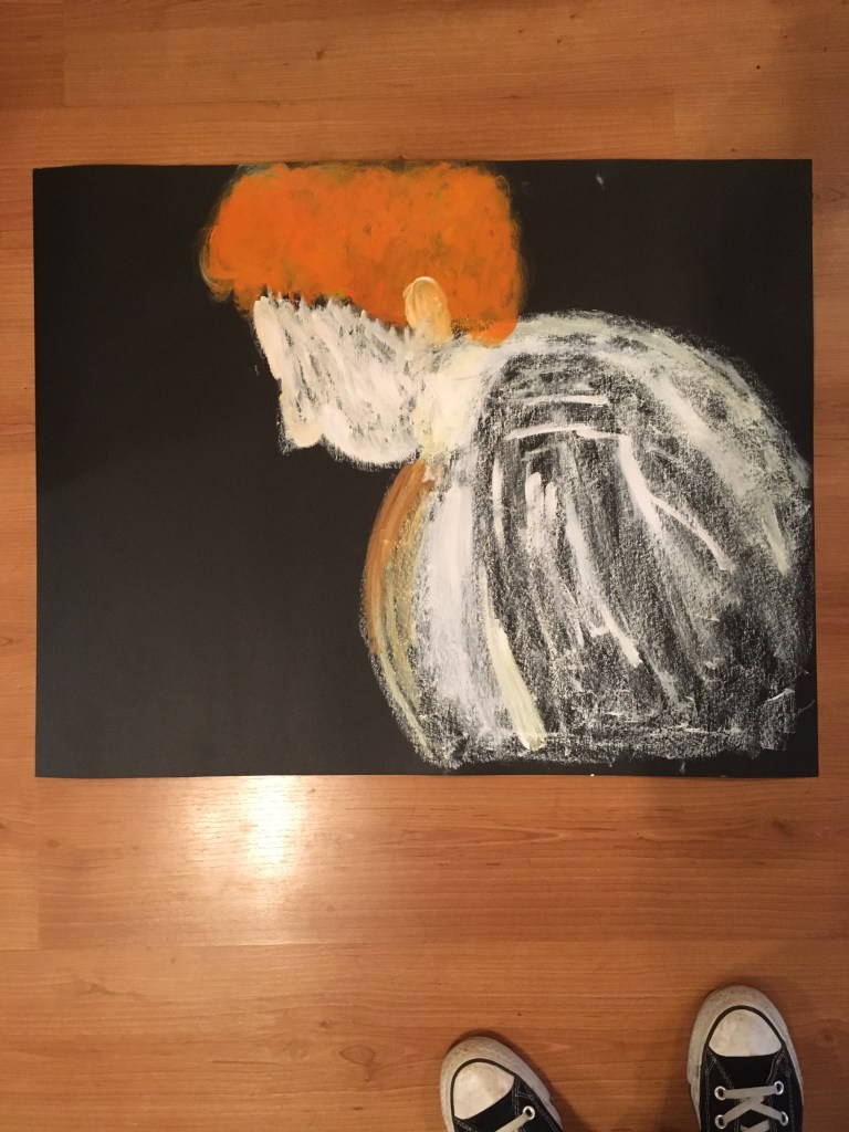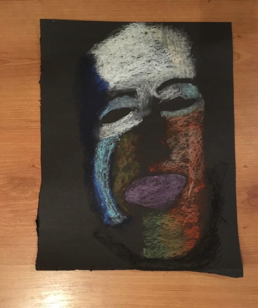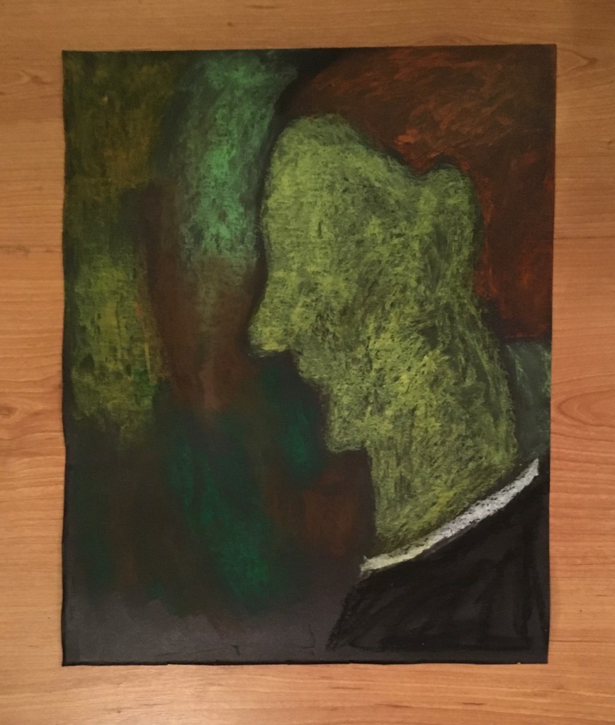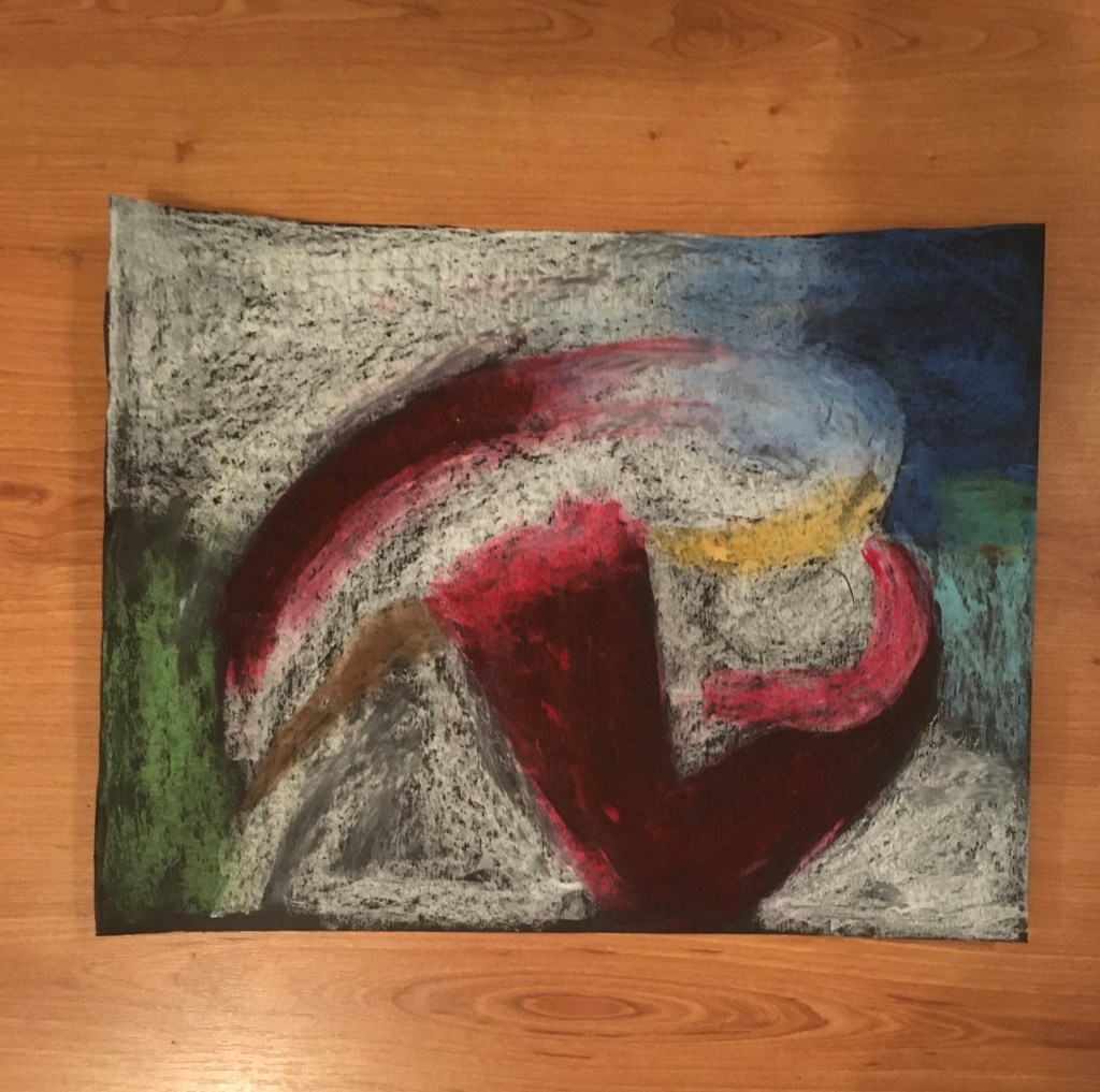 Nous avons ensuite fait un exercice dans lequel nous devions reproduire rapidement au pastel des parties d’œuvres d’art célèbres. J’ai trouvé cet exercice très difficile, d’abord pour des raisons matérielles. Les feuilles sur lesquelles il fallait travailler étaient immenses et il n’y avait pas assez de place chez moi pour pouvoir bien faire le travail rapidement. Les feuilles étaient entre autres plus grandes que ma surface de travail. J’ai fini par les couper. Je ne sais pas pourquoi les gens sont toujours obsédés par l’idée de nous faire travailler sur de grands formats. Ensuite, les pastels que j’avais achetés étaient trop mous et fondaient dans ma main. Il a fallu que je retrouve mes vieux pastels pendant l’exercice, perdant ainsi un temps considérable de travail. C’est alors devenu plus intéressant.