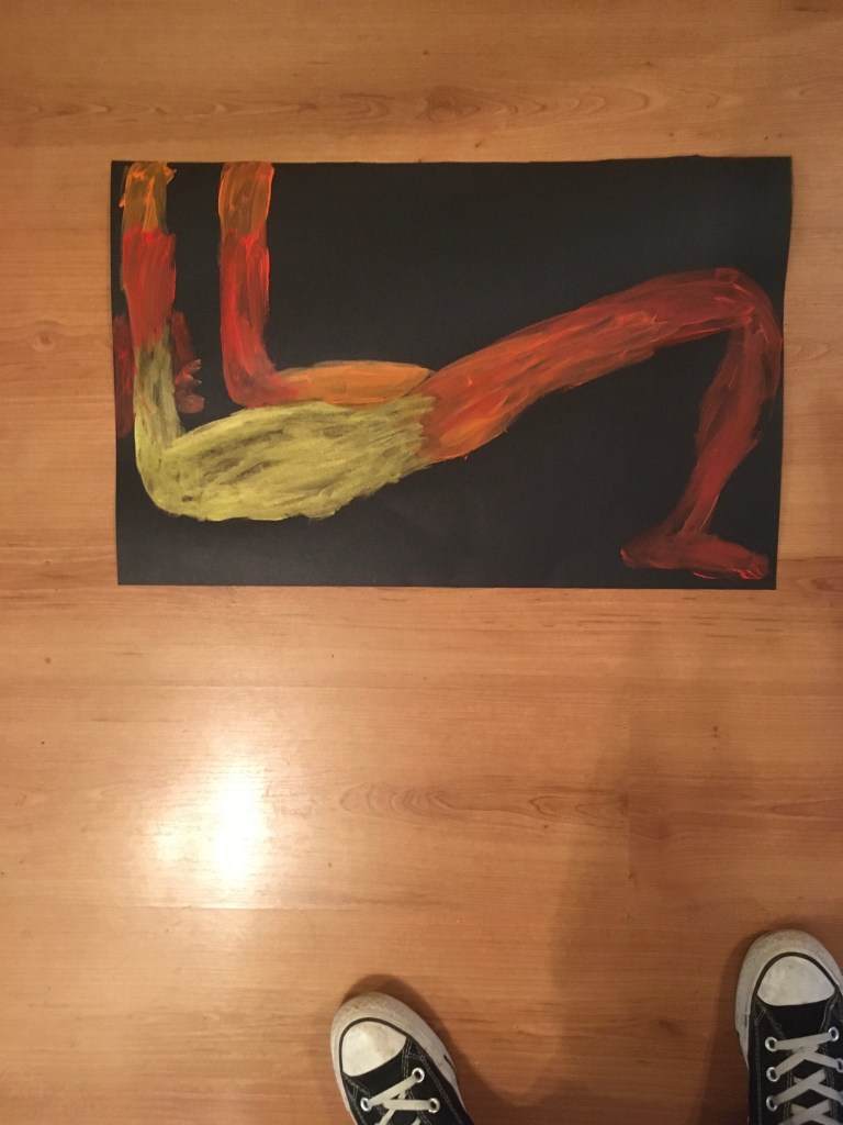 Il y a beaucoup de personnes qui n’aiment pas reproduire les œuvres des autres. De mon côté ça m’a plu en fait. Je pense que c’est lié au fait que j’ai des traumatismes par rapport à la création et ça s’est déposé dans mon corps. Parfois ça fait que j’ai de la difficulté à me mettre en action puis à bouger lors du geste créatif. Reproduire ces images m’a forcée à délier mon corps un peu pour pouvoir reproduire les figures, en plus, encore une fois, d’utiliser des teintes qui ne sont jamais les miennes, ce qui m’a permis d’explorer la couleur un peu aussi… et les textures. Je me suis forcée à ne pas remplir, à ce que ça ne paraisse pas parfait.