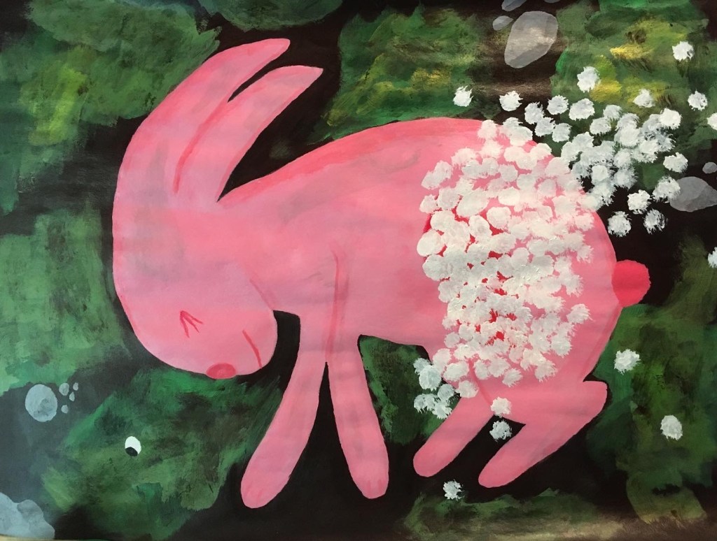 Le premier travail de la session consistait à faire une peinture spontanée à partir d’une phrase liée à la forêt qu’elle nous avait donnée. J’ai produit ce pauvre lapin en peluche éventré. Je voulais peindre un lièvre afin de respecter ma mythologie personnelle, mais comme nous devions réaliser l’exercice dans des circonstances qui me sortaient de ma zone de confort, j’ai décidé de changer un peu la thématique abordée. Elle représentait alors un plus grand défi technique pour moi parce que ce ne sont pas des couleurs ni des textures que j’ai l’habitude de faire.