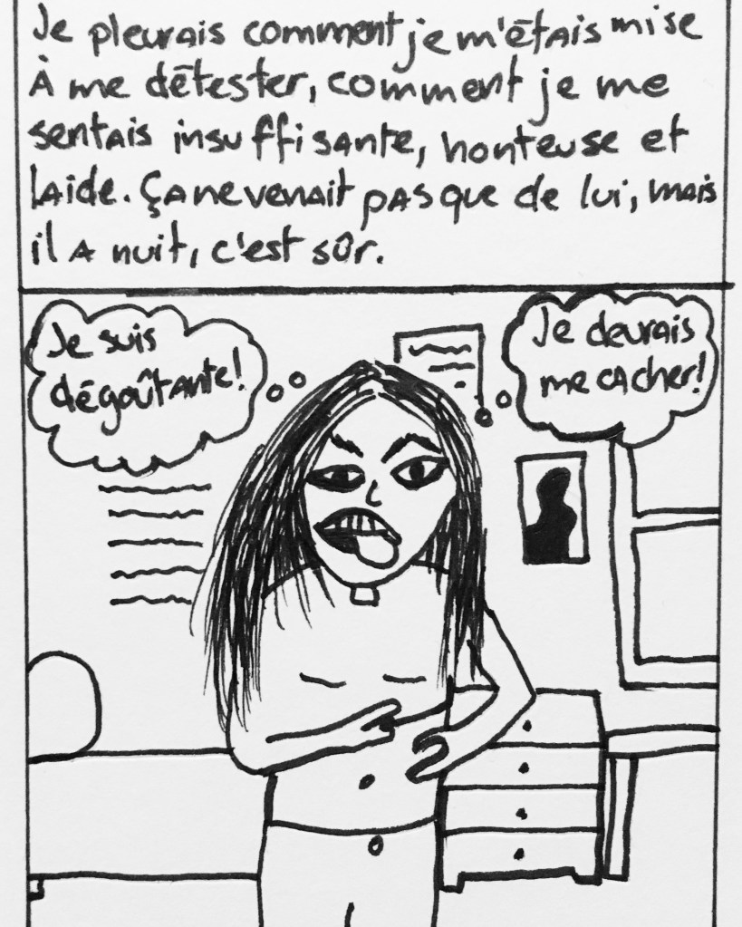 Je déteste cette excuse de la personne qui a été victime avant. J’ai vécu des violences et je suis allée chercher de l’aide. Je ne me suis pas mise à faire n’importe quoi aux autres. J’ai accepté ma responsabilité. Celle de mettre fin à ce cycle de violences et de faire le travail nécessaire sur moi pour m’en sortir. Je reparlerai de cette nécessité et cette responsabilité du travail sur soi suite à un trauma bientôt, parce que j’ai l’impression qu’elle n’est pas claire et cause beaucoup de problèmes et d’erreurs sur les plans personnel et social… Par exemple dans la nouvelle exigence de douceur qui devient elle-même une violence et finit par nuire à la santé mentale de tout le monde… mais j’y reviendrai.