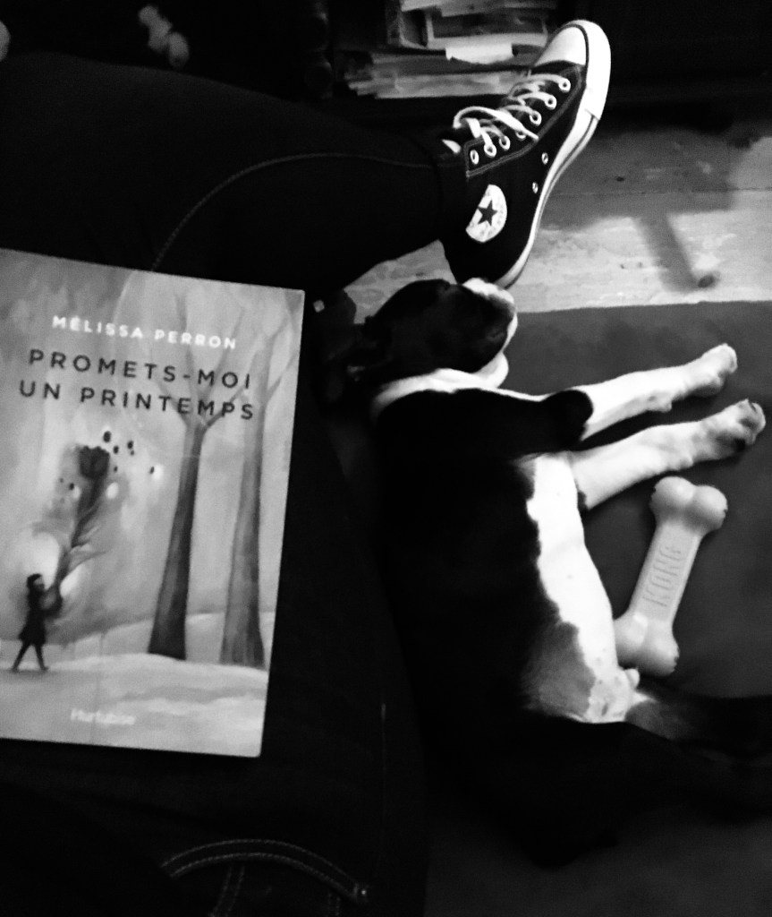 Je suis en train de terminer Promets-moi un printemps de Mélissa Perron. Ce n’est pas mon livre préféré à vie, mais il montre quand même très efficacement un vécu de dépression et, surtout, le poids que représente l’incompréhension des proches et leur refus de prendre au sérieux une maladie invisible. Ça m’a fait du bien, même si je ne souffre pas exactement du même mal que la narratrice. Ça m’a fait du bien de reconfirmer qu’il y a plus de personnes que je pense qui réfléchissent à ces sujets. Chaque voix est la bienvenue.