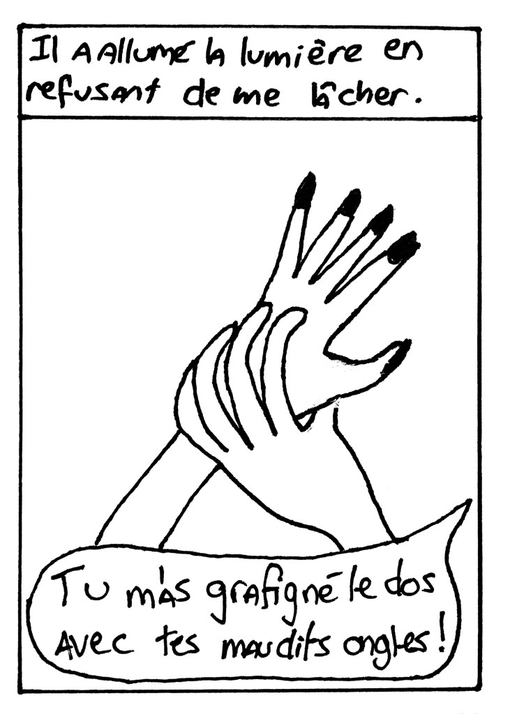 J’imagine que j’aurais une autre vision des humains si j’avais grandi dans d’autres circonstances et si j’avais eu d’autres types de relations amoureuses. Ce n’est pas le cas. Je comprends quand même qu’il existe aussi de bonnes personnes dans le monde. Je ne suis cependant plus capable de me dire que le monde n’est plein que de bonnes personnes. Ça ne correspond pas à mon expérience du monde ni de la vie. En ce sens, je suis tannée de la rigidité et de l’aveuglement des autres, surtout au sujet de la violence. Ça m’arrive souvent de me faire traiter de méchante quand je dis qu’une personne m’a fait quelque chose de violent. On cherche alors des excuses à l’autre et on me condamne à la place, alors que c’est moi qui ai été maltraitée dans la situation. Ça arrive parce que beaucoup de personnes ne veulent pas renoncer à l’illusion que nous vivons dans un monde principalement bon et qu’elles y sont en sécurité. Ouvrir leur esprit à l’idée que tout le monde ne veut pas leur bien, que des personnes ont des troubles de personnalité qui les conduisent à faire souffrir les autres, et ce, qu’elles en soient conscientes ou pas, que des horreurs existent et… leur est tout simplement insupportable. Ça leur gâcherait la vie, eux, de penser à ça… Alors ils essaient d’effacer l’existence de ces choses, de les glisser sous le tapis, de se mettre des œillères, de se rentrer la tête dans le sable bien comme il faut… tout en vous accusant d’être méchante de penser et de dire ces choses, de leur imposer d’y penser.