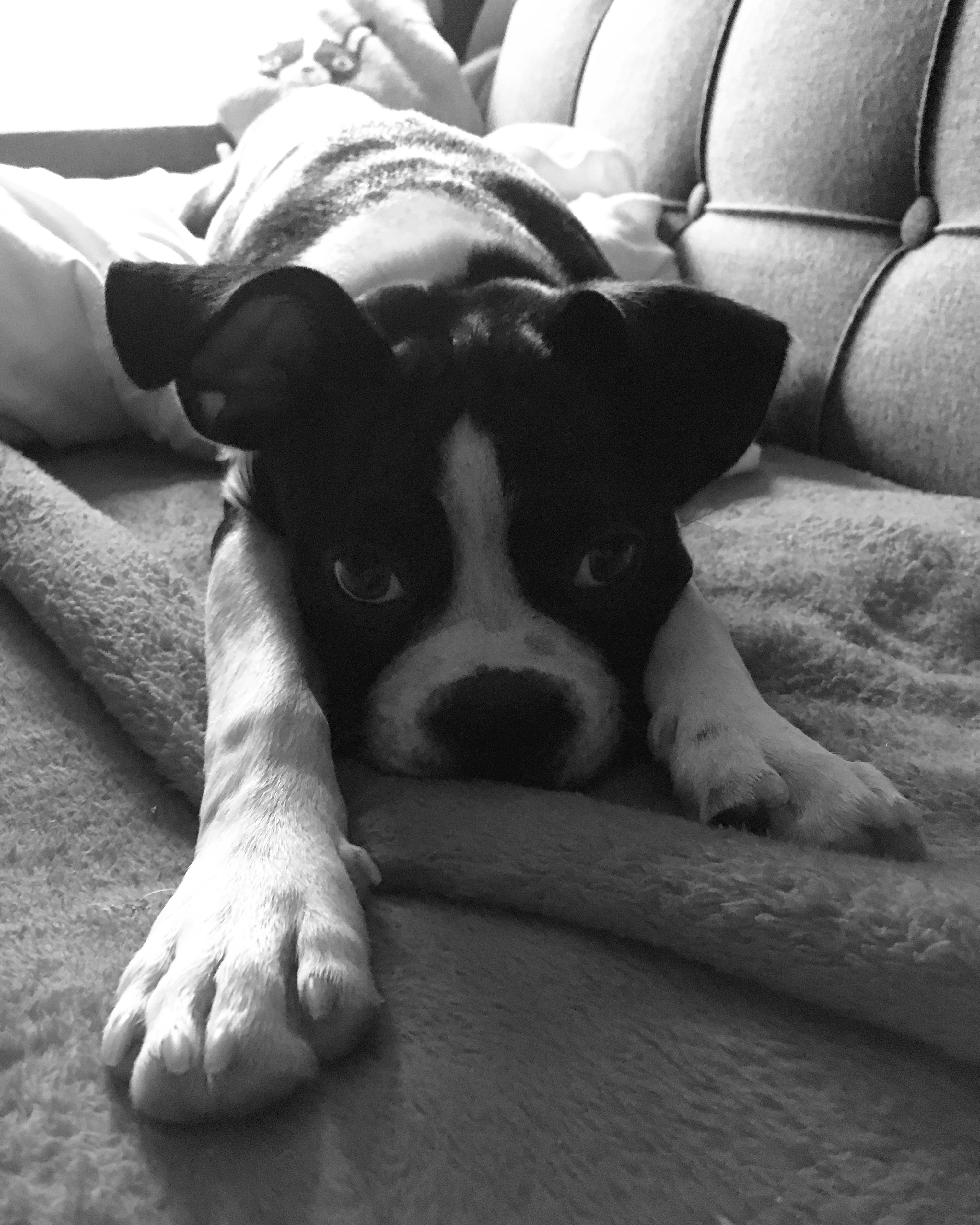 Donc aujourd’hui j’aimerais dire un petit mot sur mon magnifique Cassius. J’aimerais dire qu’il me rend infiniment heureuse depuis qu’il est arrivé, même si oui, certains jours sont difficiles quand on élève un chiot. Il n’est pas du tout un remplacement d’Ali, comme certaines mauvaises langues l’ont prétendu. Vous voyez ce que je veux dire : alors que j’étais super heureuse et reconnaissante d’accueillir mon nouveau chiot, devant mon sourire, certaines personnes se sont senties automatiquement obligées de me dire des horreurs. Pour penser ça, il ne faut encore une fois avoir aucune idée de qui je suis et ne pas du tout connaître les chiens qui ont chacun leur personnalité et sont très différents les uns des autres même au sein de la même race. Il n’y a pas de remplacement possible. Ali était un petit clown anxieux. Cassius est un petit dur amoureux. Ils ne se ressemblent pas non plus physiquement. Je joins leurs portraits respectifs. Ali m’a sauvé la vie et est probablement l’amour de ma vie. Il ne pourra jamais être remplacé. J’apprends à connaître mon petit Cassius un peu plus à tous les jours et notre lien se développe dans le temps. Il se développe différemment. C’est beaucoup moins un lien de dépendance, même s’il me manque à chaque fois que je pars travailler. Cassius est tannant, têtu, perd ses dents, est plein d’amour, sera immense pour un Boston. Je le sens dans mon cœur toujours et il fait bien son travail qui est de réguler mon système nerveux brisé par les événements qui m’ont conduit à souffrir de stress post-traumatique complexe chronique.