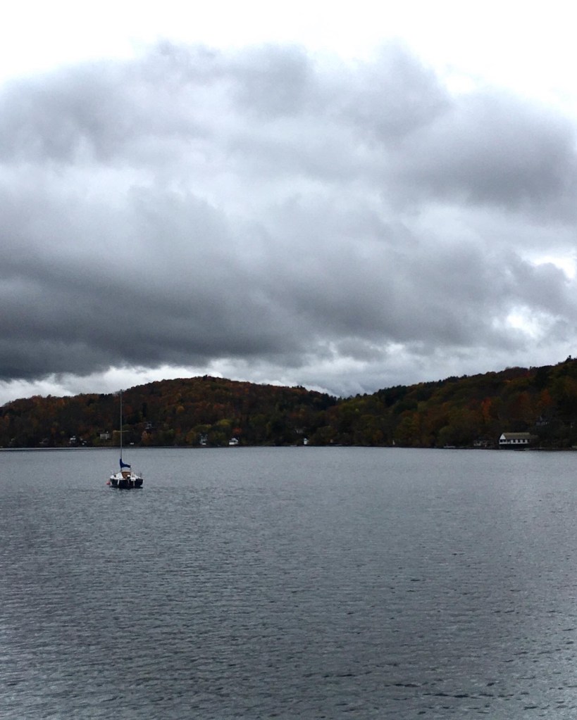 Même si j’ai choisi un endroit qui ne coûte pas très cher, la luxuriance de la nature, l’immensité du lac Massawippi, les délices du terroir, les bières de microbrasseries et le calme me font me sentir dans un luxe infini. Ça ne me prend pas grand-chose pour être heureuse. Ça me le confirme. Je me sens calme. Je me sens rassurée. Je ne m’étais pas sentie comme cela depuis des mois. Je vais continuer les autres billets, mais j’avais besoin de respirer un peu et de faire de la route. Ça m’aide toujours beaucoup à réfléchir. Il a plu incroyablement. J’ai quand même marché pour faire le repérage des photos que je prendrai quand le ciel s’éclaircira un peu. C’est un automne incroyable et magnifique. Les maisons font rêver. Je lis un roman policier qui se passe ici. Je suis un peu en vacances. J’aurai ensuite beaucoup de travail jusqu’à la fin de la session.