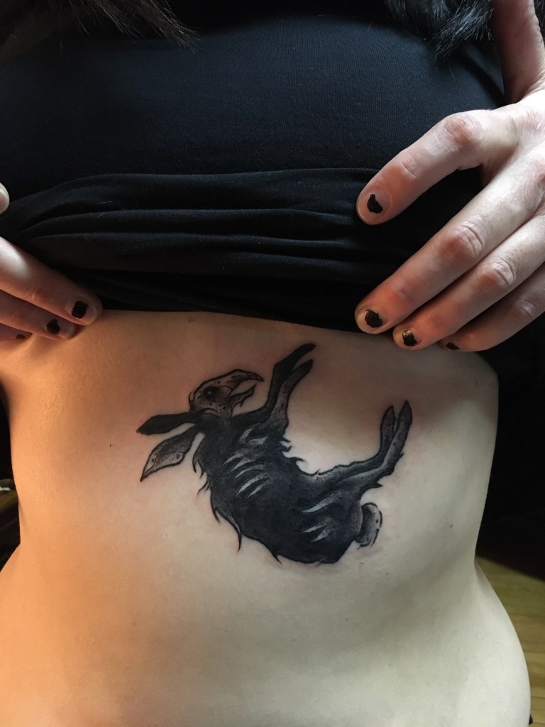 C’est en mélangeant ces parties de mon histoire et de mes intérêts que je suis arrivée au désir de me faire tatouer un lièvre mort près du cœur. J’ai appris, en lisant sur la symbolique du lièvre par la suite, que c’est aussi, pour l’anecdote, mon signe astrologique selon certaines croyances… Il représente aussi la résurrection et l’incarnation dans la tradition chrétienne. Quoi de mieux alors, pour symboliser et inscrire dans mon corps les souffrances que j’ai traversées, qu’inscrire un petit lièvre mort sur mon corps? Je l’ai placé près du cœur pour me souvenir du fait que malgré tout ce que j’ai enduré, malgré le fait que certaines parties de moi sont mortes au fil du temps, je les porte encore en moi et je suis encore là pour aimer.
