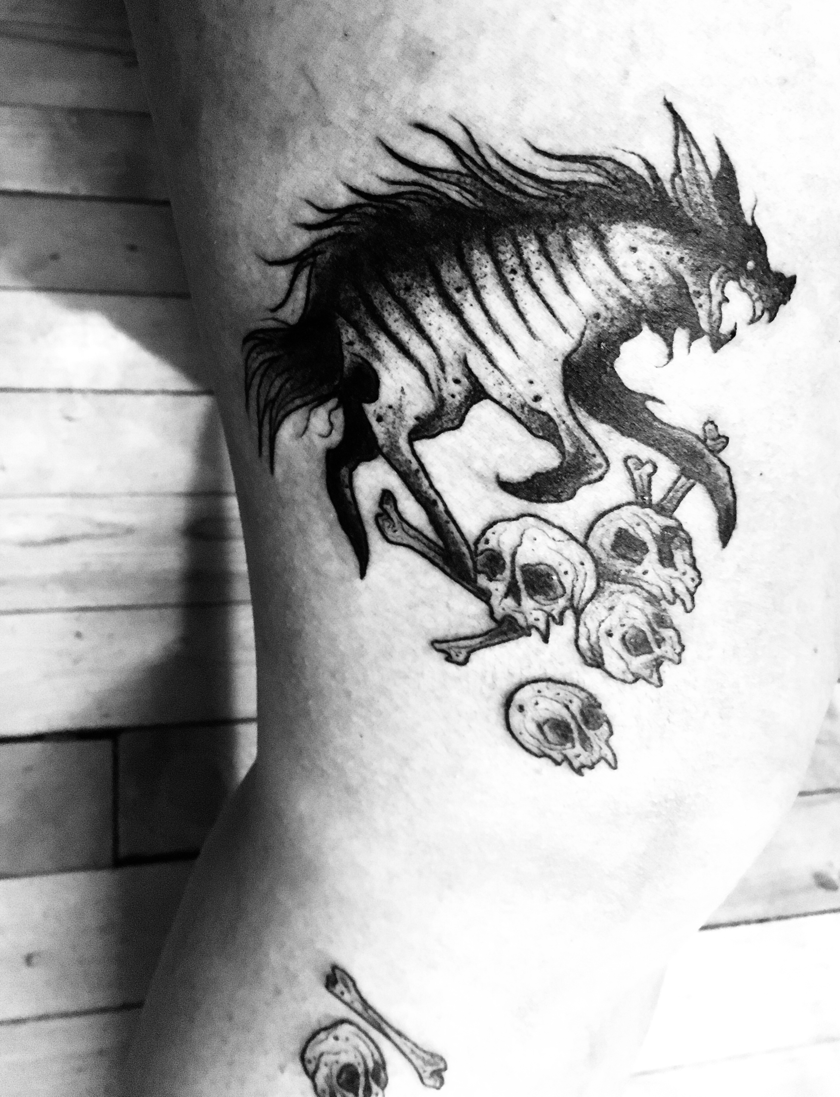 Il s’agit donc d’une hyène, comme vous pouvez le constater, accompagnée de petits crânes et ossements qui tombent le long de ma jambe droite.
