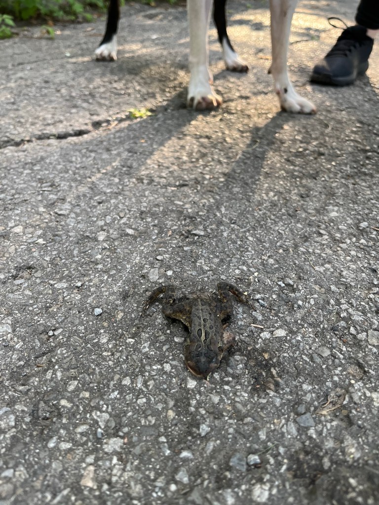 Je me réveille, je sors le chien, je fais du café, je lis un temps (devant une lampe de luminothérapie l’hiver), j’écris un moment (des choses qui me perturbent, des choses pour lesquelles je suis reconnaissante aussi minuscules soient-elles, des choses qui me font envie, qui me rendent heureuses et…), je sors promener le chien 1h-1h30 après (donc oui, je sortais beaucoup contrairement à ce que certains m’ont dit), je rentre et je commence mon horaire, horaire réparti entre des choses que je dois faire, des explorations et des passions. Le tout découpé en blocs de différentes longueurs. Comme tout le monde, j’étais plus fatiguée pendant la pandémie (Je sais qu’elle n’est pas terminée, oui… Je parle des pires périodes traversées jusqu’à présent.), je finissais par abdiquer et faire du sofa en regardant quelque chose qui m’intéressait réellement. À quelque part là-dedans, je mangeais. Puis le soir je sortais le chien à nouveau, mais un peu moins longtemps. Puis, j’allais me coucher et je recommençais le lendemain. Le fait de m’imposer un cadre et des activités comme cela m’a donné beaucoup d’espoir et un sentiment de force au quotidien. Je pouvais être fière de moi. J’avançais dans ma vie malgré l’immobilité du monde dans lequel je me sens souvent de toute façon comme cette grenouille déplacée et mal en point que nous avons croisée ce matin durant notre promenade.