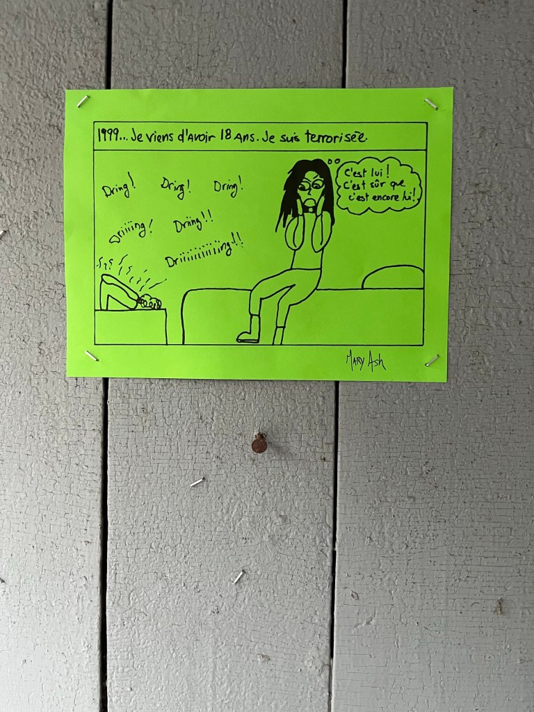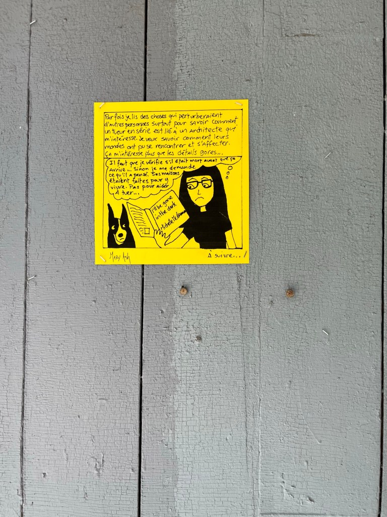 Hier soir, durant la nuit, la grille d’entrée de ma cour était restée ouverte et une personne a arraché la case de bd que j’avais affichée dans l’entrée et a pris toutes mes cartes d’affaires… J’espère que c’était juste une personne saoule qui n’allait pas bien. C’est mesquin en tout cas. Le fait que la personne ait emporté les choses avec elle au lieu de les crisser par terre comme une bonne personne saoule aléatoire l’aurait fait me suggère que c’était plutôt volontaire et ciblé. Si c’est la personne que je pense, c’est impressionnant de petitesse et violent et la personne devrait demander de l’aide pour gérer ses pulsions et son agressivité parce que ça commence à aller de plus en plus mal son truc… J’ai été « punie », j’imagine… On a furtivement essayé de m’effrayer… Ça ne va décidément pas. C’est un comportement lâche, inquiétant et inacceptable. Si ça devient nécessaire, la police s’en mêlera. C’est aussi un peu ironique puisque cette semaine nous allons voir, avec mes étudiants, un documentaire sur le harcèlement que vivent certaines femmes féministes qui dénoncent publiquement certains comportements violents et misogynes… J’imagine que c’est un signe que ce n’est pas fini et qu’il y a toujours un problème grave dans la société.