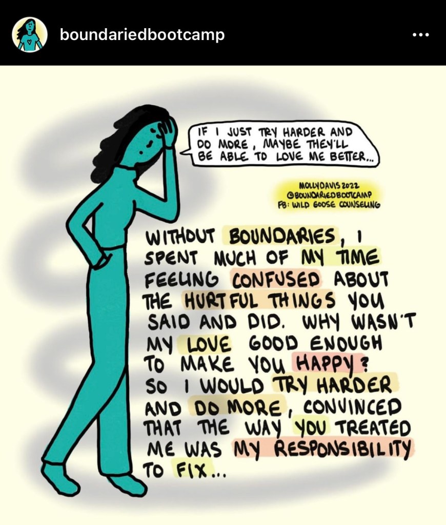 Quand on n’a pas de limites comme individu, on est en quelque sorte poreux, au service de l’autre et rempli par lui. C’est difficile de savoir qui on est. C’est rare aussi qu’une personne qui n’a pas des limites claires ait une bonne estime de soi. C’est aussi un peu impossible au sens où elle est en quelque sorte dressée à être ce que l’autre veut qu’elle soit et ne sait donc pas réellement qui elle est. Il n’y a pas beaucoup de place pour exister dans ce cadre. Il n’y a pas non plus vraiment de possibilité de s’affirmer puisqu’on ne sait pas qui on est et donc on ne sait pas non plus ce qu’on veut ni ce qui est bon pour soi ou pas.