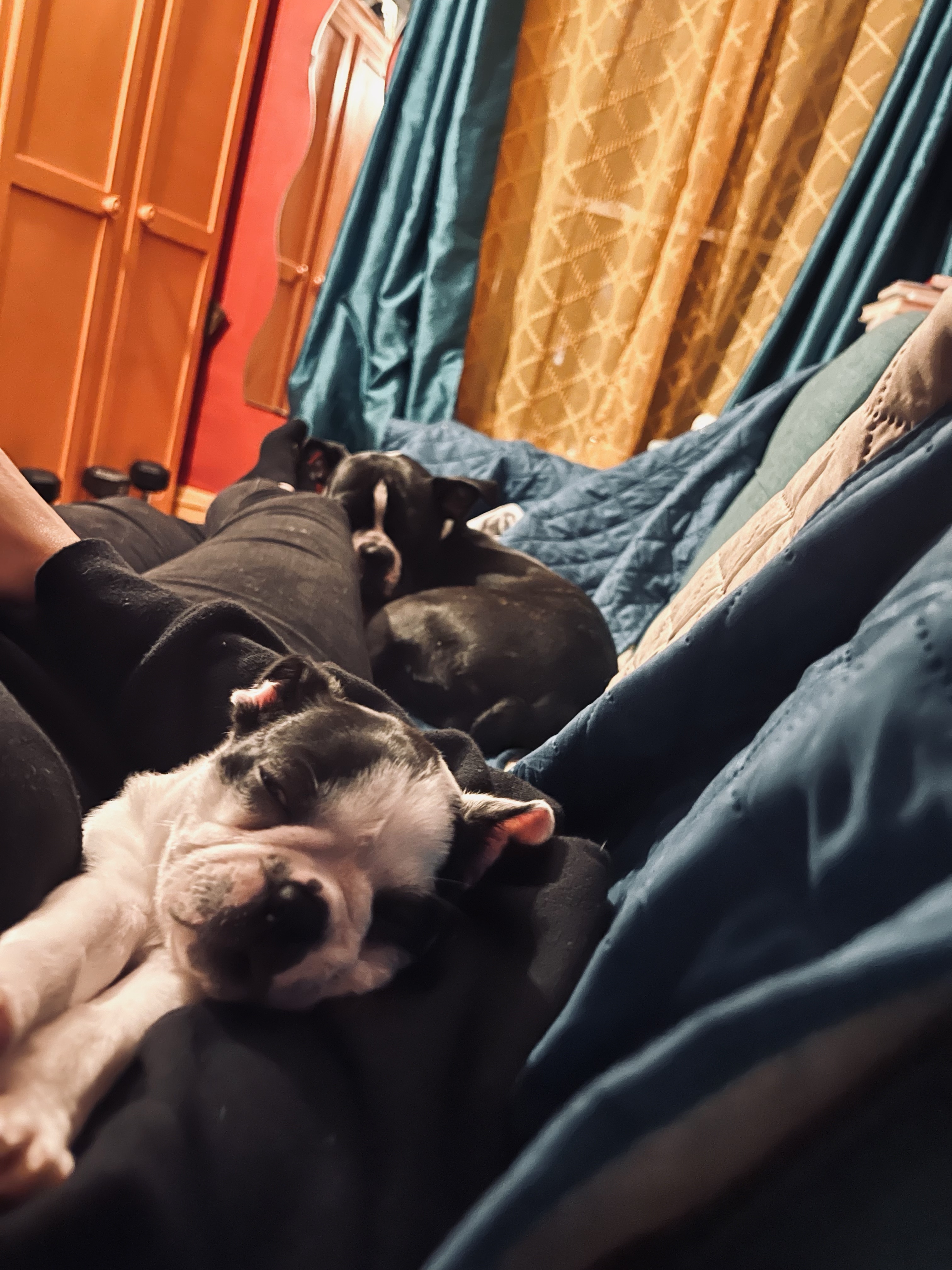 J’ai adopté un deuxième chien, comme vous savez. Une petite demoiselle. Les choses se passent bien à part qu’elle a un petit parasite qui nous ralentit, mais elle est sous traitement. Elle a fait ses nuits rapidement. Mes chiots n’ont jamais été du type à pleurer longtemps durant la nuit. Notre attachement se fait généralement très vite et ils ne souffrent pas d’anxiété de séparation. Quand je suis allée la chercher, c’est comme si elle m’avait choisie sans savoir que je l’avais déjà choisie. Elle a poussé les autres chiots pour arriver plus vite à moi. Elle est immédiatement devenue comme un pot de colle. Elle dort en faisant la crêpe sur moi. Mon beau garçon dormait (et dort encore) sur le dos les pattes écartées. L’autre chien l’aime déjà vraiment beaucoup et ils sont très beaux à voir. Il y a eu un peu de jalousie, mais dans l’ensemble, je pense qu’il a plus peur de me perdre et de perdre ses privilèges qu’il n’éprouve de colère contre elle puisqu’il adore jouer avec elle et est très doux. Il est juste un peu pataud. 33 livres contre 5 livres… Les luttes ne sont pas très justes, mais elle a du caractère et s’en sort très bien. J’avoue que ça me fait beaucoup de bien quand nous regardons un film à la fin de la journée et que je suis ensevelie sous les chiens. Ils sont si doux, bienveillants et chaleureux. Tant d’amour!