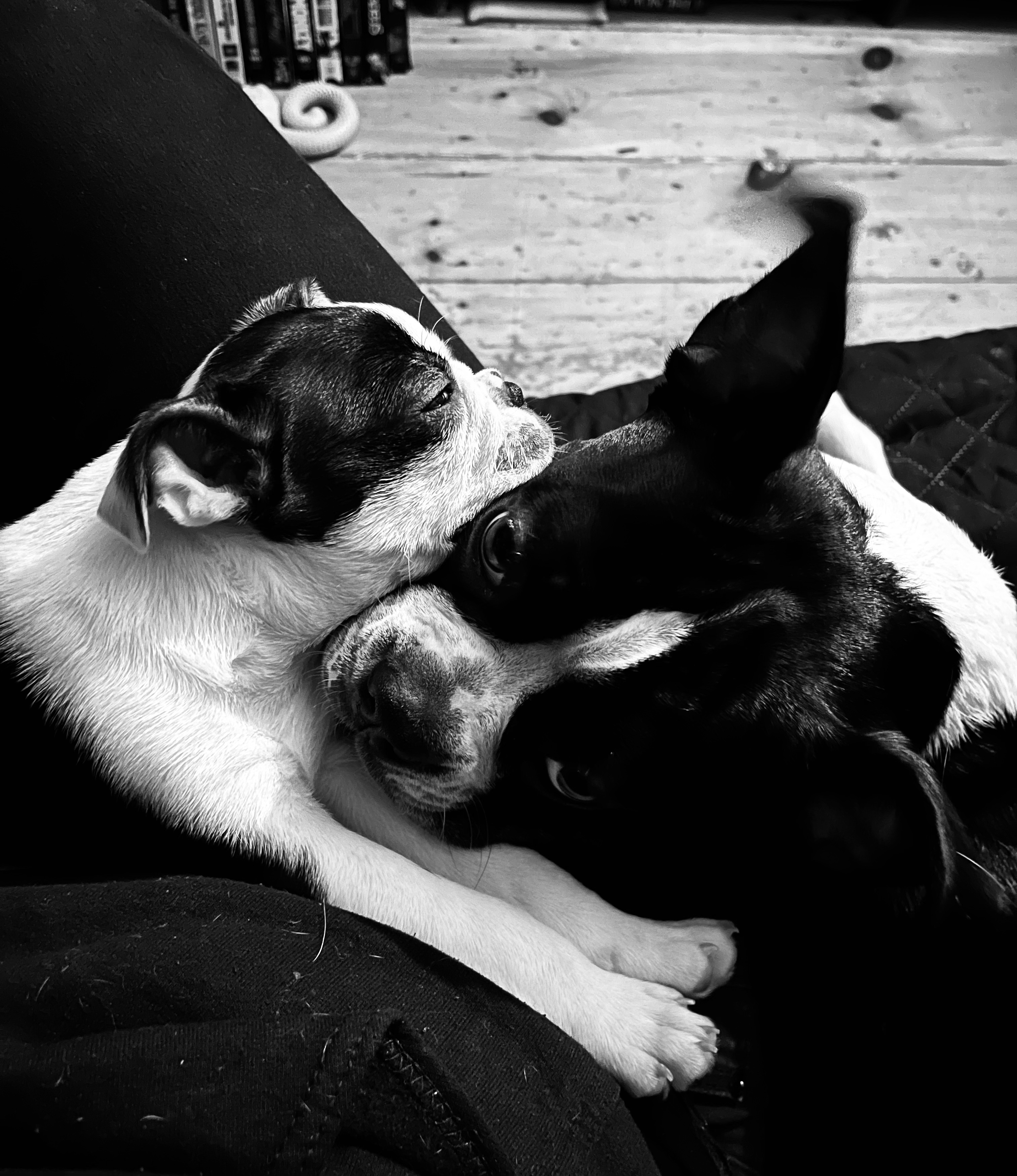 Il y a un stade que j’aime particulièrement dans le développement des chiots. C’est quand leur perception spatiale n’est pas encore totalement développée. J’habite un petit appartement sur deux étages. L’escalier qui monte à l’étage est dans la cuisine. Les chiens ne sont pas autorisés en haut sauf à l’heure du sommeil. La petite ne connaît pas encore les règles. À 11 semaines, elle est beaucoup trop jeune pour cela. Avec chacun de mes chiots, il y a eu un moment où, marchant avec moi dans la cuisine, ils pensent que nous allons au même endroit. Je commence alors à monter l’escalier parce que j’ai quelque chose à faire à l’étage et le chiot continue sa route joyeusement de son côté, pensant que nous marchons côte à côte et que nous allons au même endroit. Les chiots Boston terrier ont des oreilles très molles vraiment attendrissantes qui ne se redresseront que plus tard et qui, pendant un temps, tremblent pratiquement à chacune de leur respiration, ce qui est très mignon.