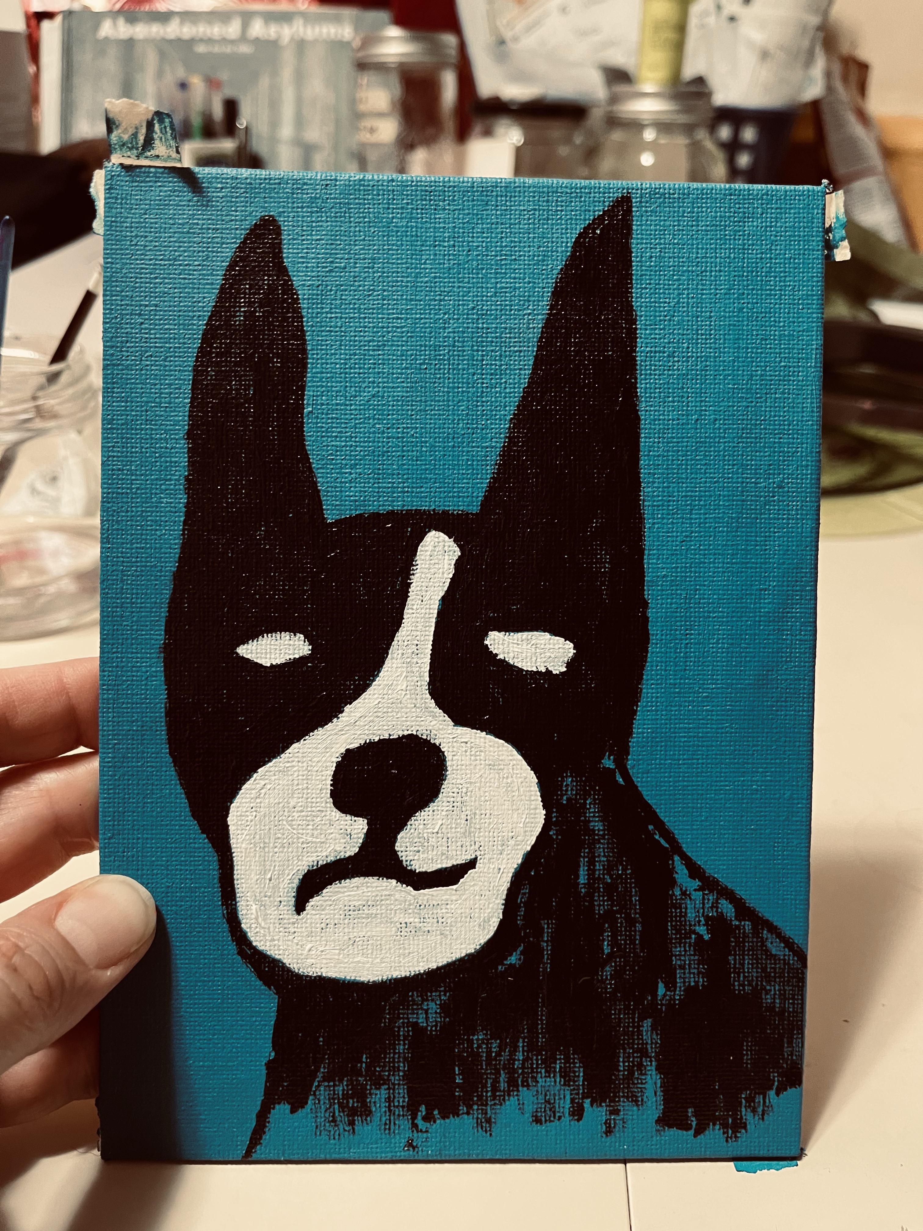 J’ai commencé d’autres petites toiles qui seront disponibles bientôt. J’aime les prendre en photos quand leurs yeux sont encore vides. Je ne sais pas pourquoi. Celle-ci est faite à partir d’un de mes premiers dessins de mon premier Boston quand j’ai recommencé à dessiner. Il a l’air de Batman un peu, oui.