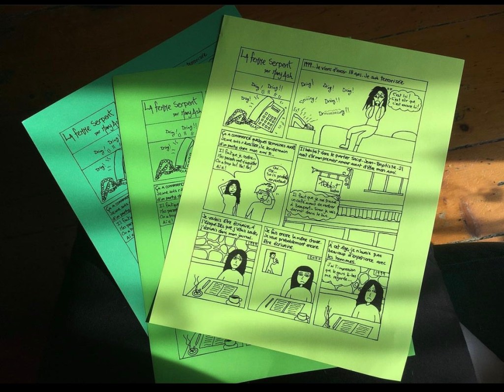 Ça veut cependant dire que j’ai vraiment beaucoup de zines à faire! Je ne les avais pas recomptés depuis Expozine l’an dernier et il en reste pas mal moins que je pensais. C’est ok. C’est bien de faire des tâches manuelles aussi. Ça me donne un sentiment de devoir accompli et de temps bien investi après. Autant faire ça maintenant puisque j’aurai peu envie de le faire une fois la session amorcée et mieux vaut que tout soit prêt à l’avance pour Expozine sinon je risque de manquer de temps rendue à la fin novembre. J’aimerais en terminer un nouveau aussi. Celui de la femme serpent. Il est pas mal avancé même si je l’ai mis de côté depuis un moment. Ce n’est pas parce que je n’avais pas envie de le faire.