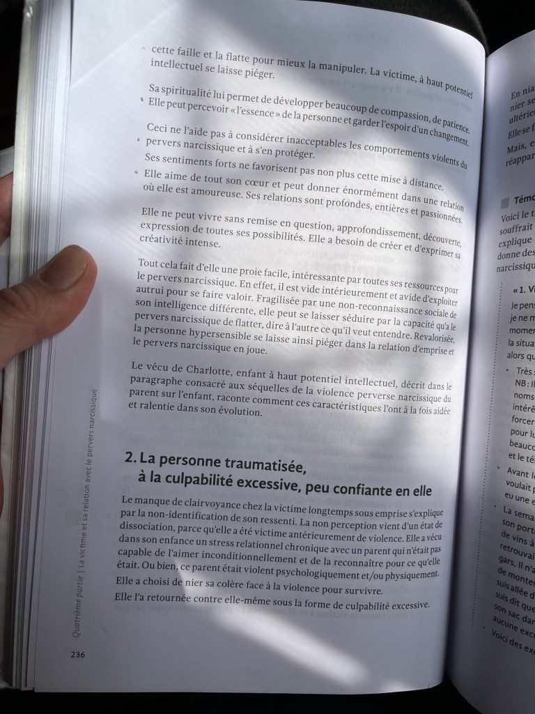 Le psy a dit aussi que c’était irréaliste de penser qu’un jour je serais indifférente quand je verrais cette personne. Ça a été un trop gros traumatisme et une durée trop longue de harcèlement pour ça. Ça me fait du bien d’abandonner cette idée. De toute façon les gens qui veulent avoir l’air indifférents le font la plupart du temps pour blesser l’autre et ça ne m’intéresse pas de blesser qui que ce soit donc je vais juste accepter que c’est arrivé, qu’il y a des personnes comme ça, vivre ce que j’ai à vivre et continuer d’avancer. Je n’en meurs pas même si ça réveille des émotions pénibles à chaque fois que je vois sa maudite face.