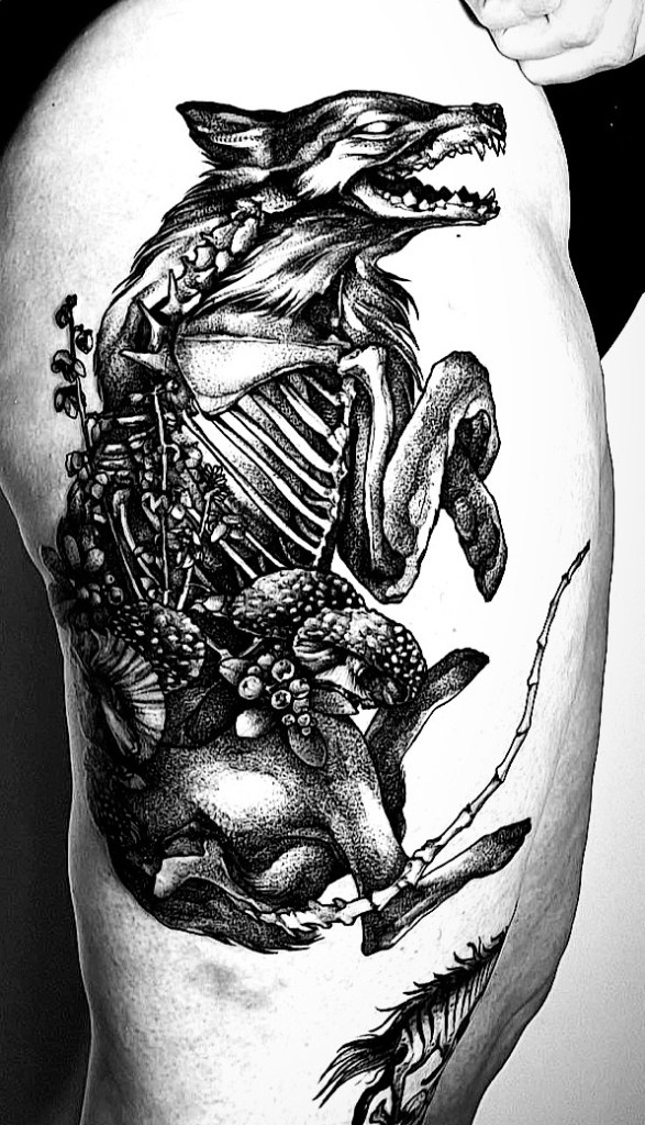 Je reparlerai de violence, mais dans d’autres contextes. Je vous laisse une photo de mon beau renard féroce malgré la mort. La photo est de ma chère tatoueuse sur qui j’écrirai un jour un billet plus complet. Elle souhaite de tout cœur à mon voisin dont elle trouve qui agit comme un vilain de dessin animé ridicule de « Fuck off forever » et de se casser une jambe en partant. « That guy is crazy and ridiculous » (ses mots).