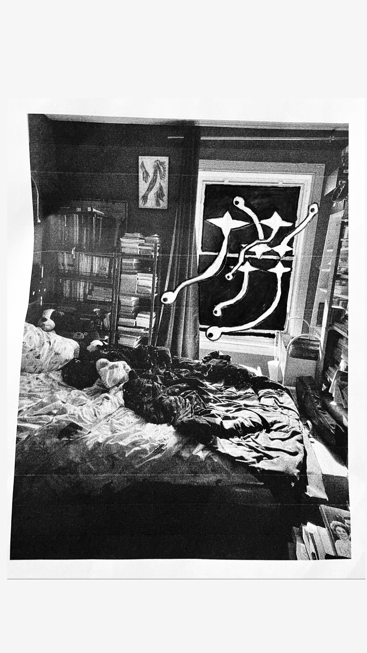 J’ai commencé un peu plus le travail sur mon livre sur ma période de harcèlement pour mon cours de photo. C’est juste un test sur une impression cheap d’une photo croche avec une errance dans quel crayon blanc utiliser, mais c’est excitant. C’est le symbole de Subaru qui remplace des étoiles qui deviennent des yeux qui m’espionnent… parce que le harceleur conduit une Subaru. Il est redisparu enfin. Joie!