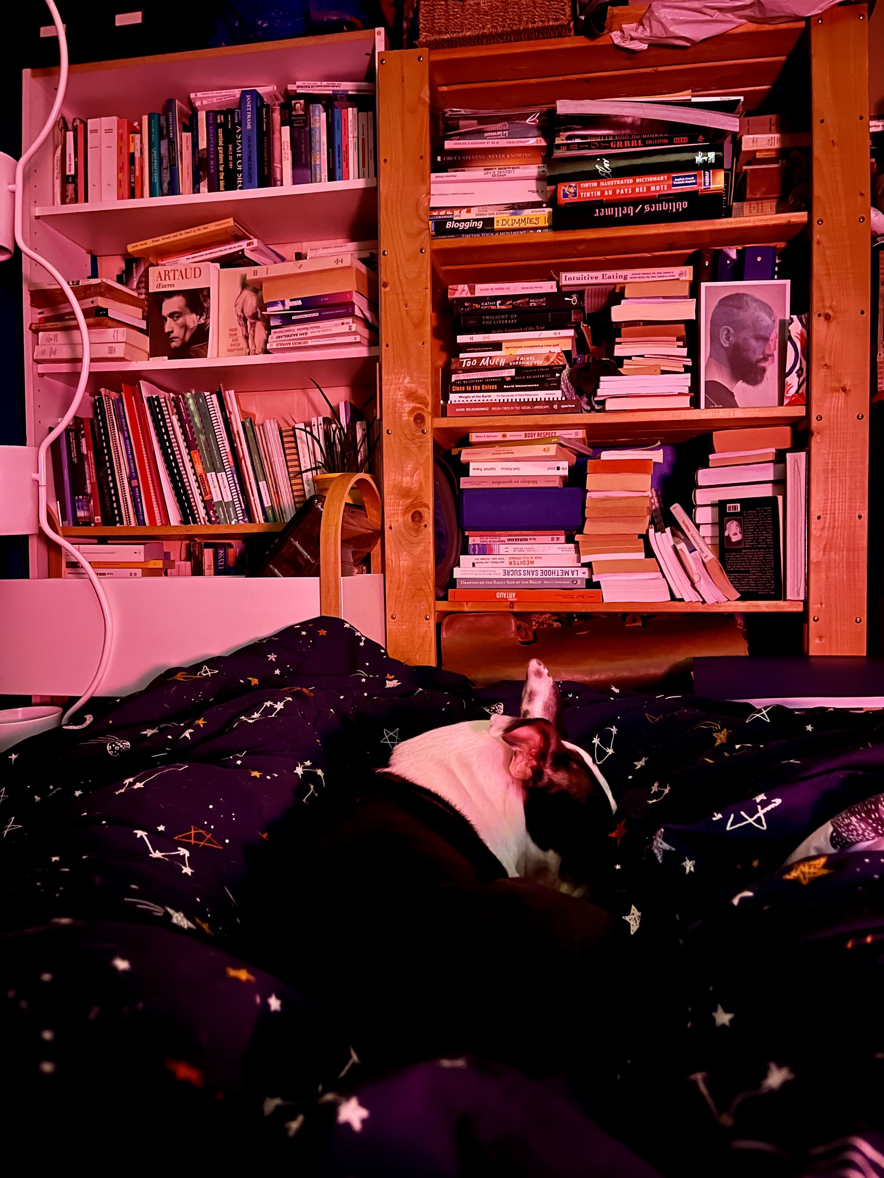 C’est bien beau, mais sept heures de temps entourée d’autant de personnes c’est assez épuisant pour l’introvertie en moi. J’étais heureuse de rentrer. J’avais deux petits monstres plein d’amour qui m’attendaient à la maison en rentrant et m’ont fait la fête avec de devenir deux pots de colle intenses. Je suis devenue assez bonnes dans les caresses synchronisées maintenant. Je pense qu’il y aura des petites pattes gelées demain matin avec la neige qui arrive, mais ça va. Nous resterons au chaud pour que je finisse mon projet photo.
