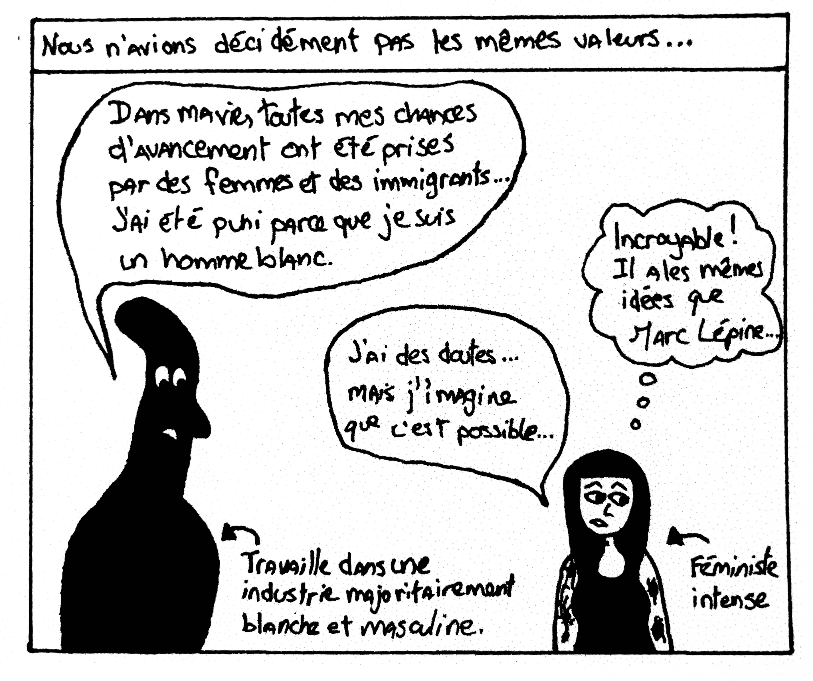 C’est vraiment le commentaire le plus stupide, insensible et gratuitement violent que j’ai reçu sur mon travail, ce qui est ironique puisqu’au cours précédent, je l’avais remercié de ne jamais faire de commentaires déplacés sur mes projets… Il aura eu envie de se venger de ma gentillesse, j’imagine. Ce qui est tout à fait normal, sain et naturel…