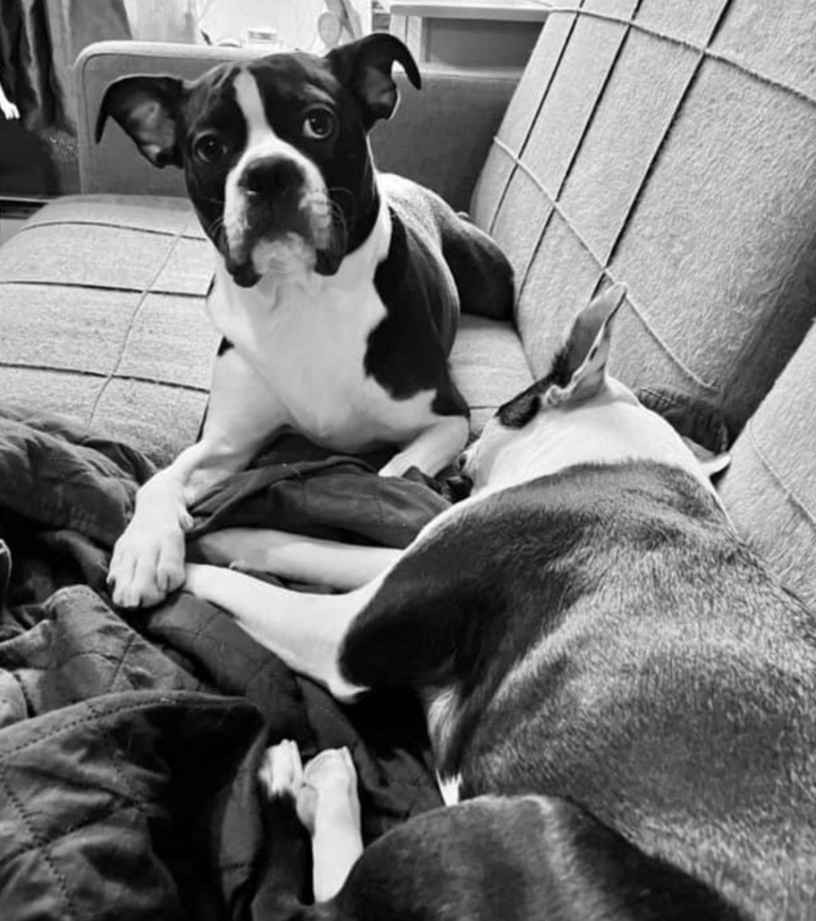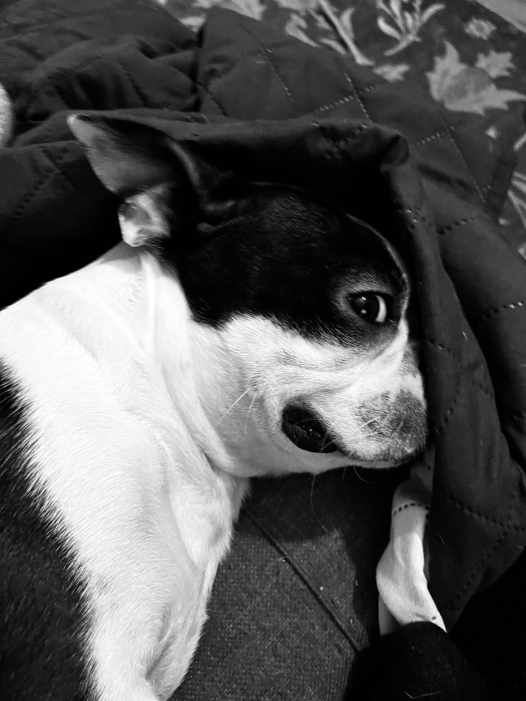 Il y a quand même eu de bonnes choses aujourd’hui. J’ai avancé dans mes corrections, j’ai eu des moments doux avec les chiens et l’homme qui s’occupe de faire les rénovations du bloc m’a apporté un cadeau de Noël. C’est une super grosse toile qui m’aurait coûté cher et qu’il a trouvée je ne sais pas où. Ça m’a fait plaisir.