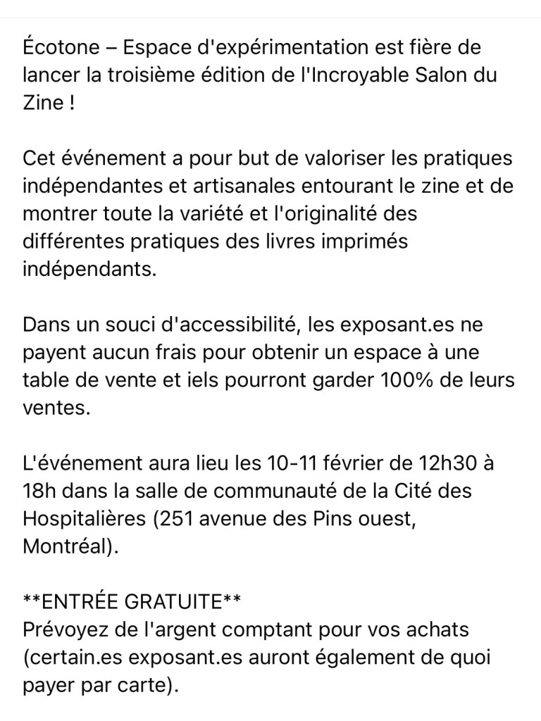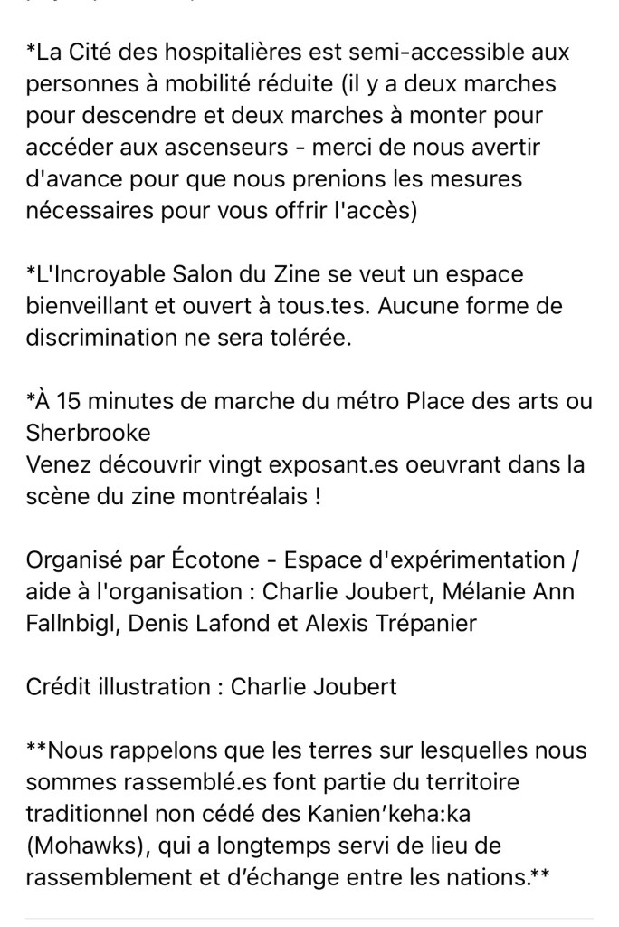 La semaine prochaine, je serai à L’incroyable salon du zine les deux jours. Je vous mets les infos ici: