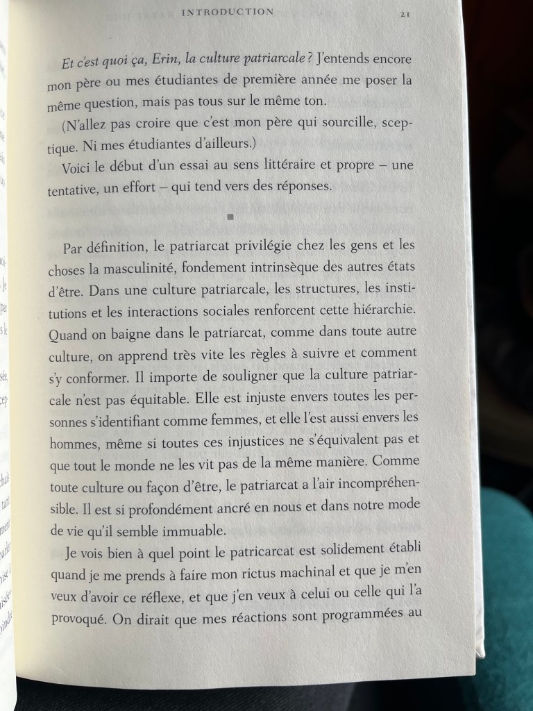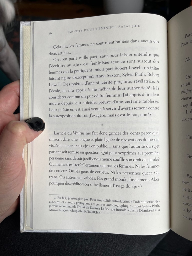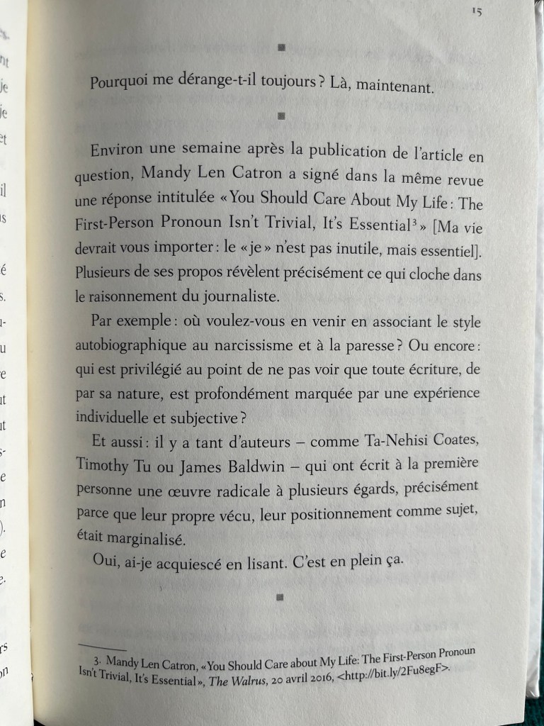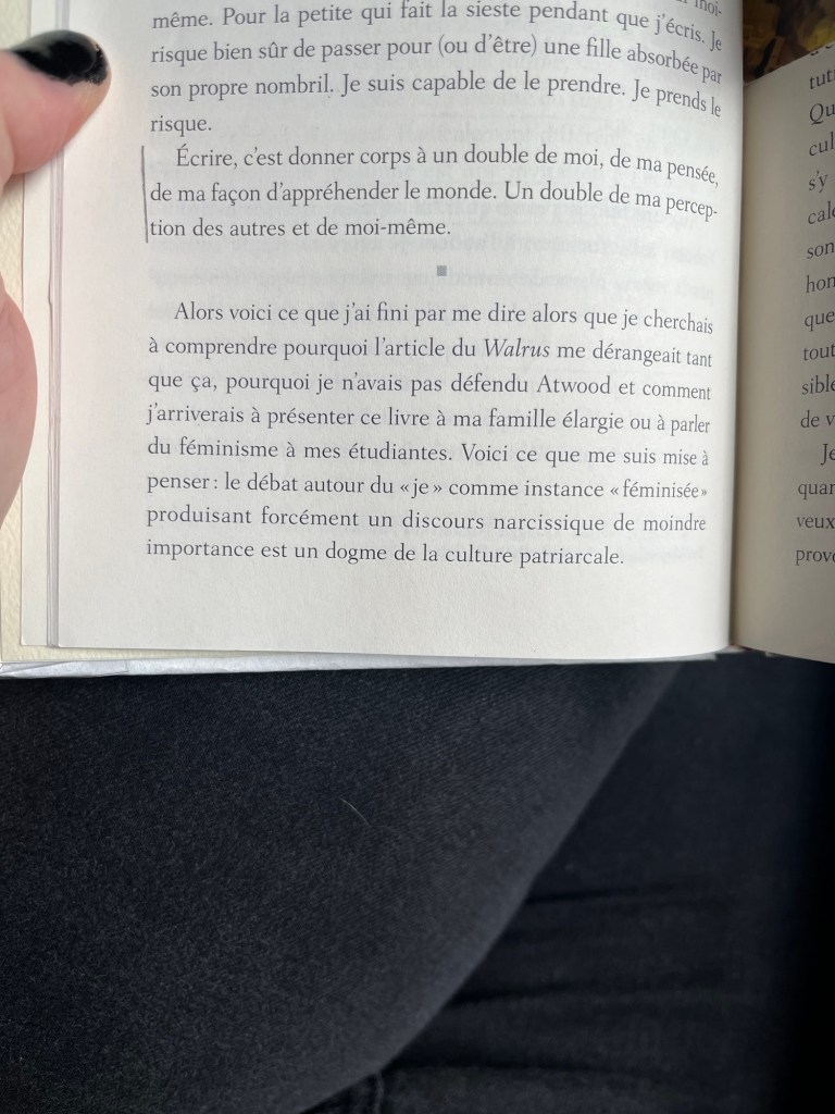 Je vais aller me coucher, mais avant je voulais vous partager la lecture que j’ai commencé aujourd’hui. Si vous n’allez pas lire, ça parle des personnes qui traitent les femmes de narcissiques quand elle créent à partir de leur expérience personnelle et en parlant au « je ». Je ne savais pas qu’il y avait un passage sur ça dans ce livre que j’ai juste emprunté parce que j’aimais beaucoup le titre. La vie est une constellation infinie de liens qui se tissent à notre insu.