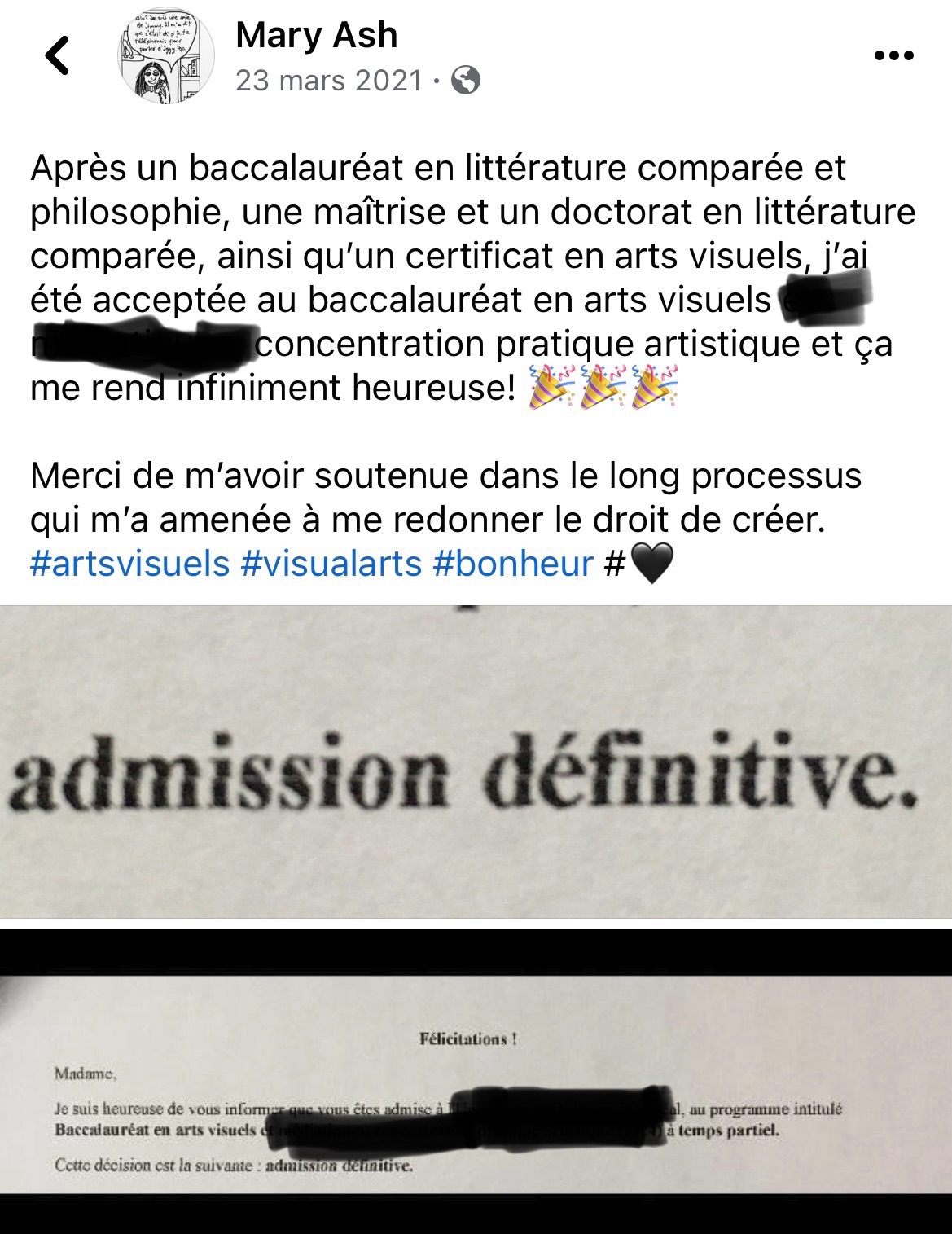 J’étais heureuse d’avoir fait ma demande à l’autre programme avant de recevoir la réponse pour la plainte. Je pense que l’état de ma confiance en moi aurait été plus bas si je ne savais pas déjà que j’étais acceptée. Ça a pris moins de 48 heures… mais j’ai un dossier avec une moyenne de A+ là-bas… pour toute la maitrise et le doctorat … alors les gens qui pensaient acheter mon silence avec une bonne note, comme si c’était spécial, ils se mettaient assez profondément le doigt dans l’œil. J’en ai déjà plus que j’en ai besoin. Si je pouvais, j’en donnerais aux personnes qui ont vécu des choses difficiles pour les aider à rentrer dans le programme où ils veulent aller. J’aimerais vraiment ça pouvoir.