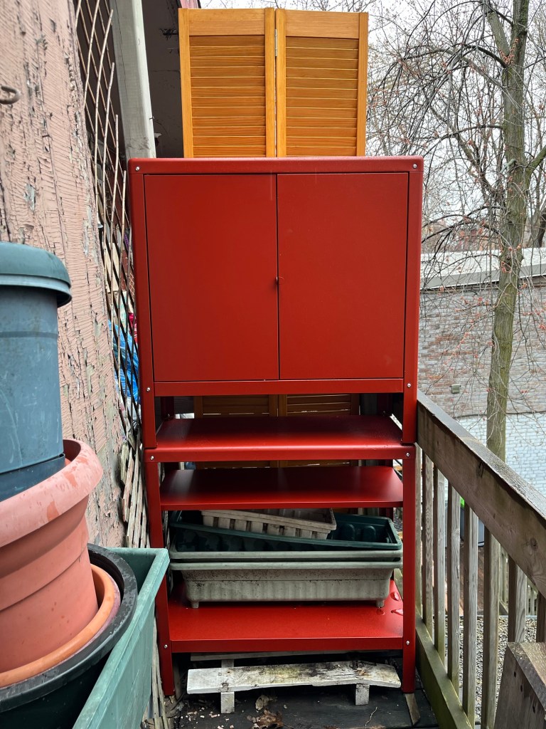 J’ai quand même réussi à relaxer vraiment ces deux derniers jours. J’ai lu, j’ai assemblé des meubles, j’ai commencé à aménager mon balcon. J’ai volé des portes dans les poubelles d’un monsieur qui rénove son appart pour me donner une peu d’intimité. J’en ai placé seulement une. Je placerai le reste quand il fera beau, mais j’étais tellement décidée à assembler le meuble rouge et ça aurait été difficile après de le déplacer à nouveau pour aller mettre la porte derrière. Avec des fleurs grimpantes dessus, ce sera parfait. Mes plants croissent tranquillement justement. Ils seront prêts à temps pour le jardin.