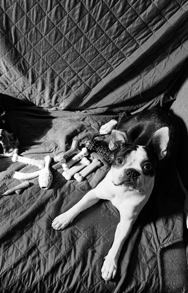Je vous laisse une vieille photo d’Hannah pour vous faire sourire. Elle a l’air tellement fière de ses jouets. Elle avait moins d’un an. Ça se voit à l’oreille qui plie vers l’arrière… les oreilles de Boston, comme celles de bien d’autres chiens, ne se dressent complètement que graduellement…. Et parfois ça n’arrive jamais, comme Cassius.