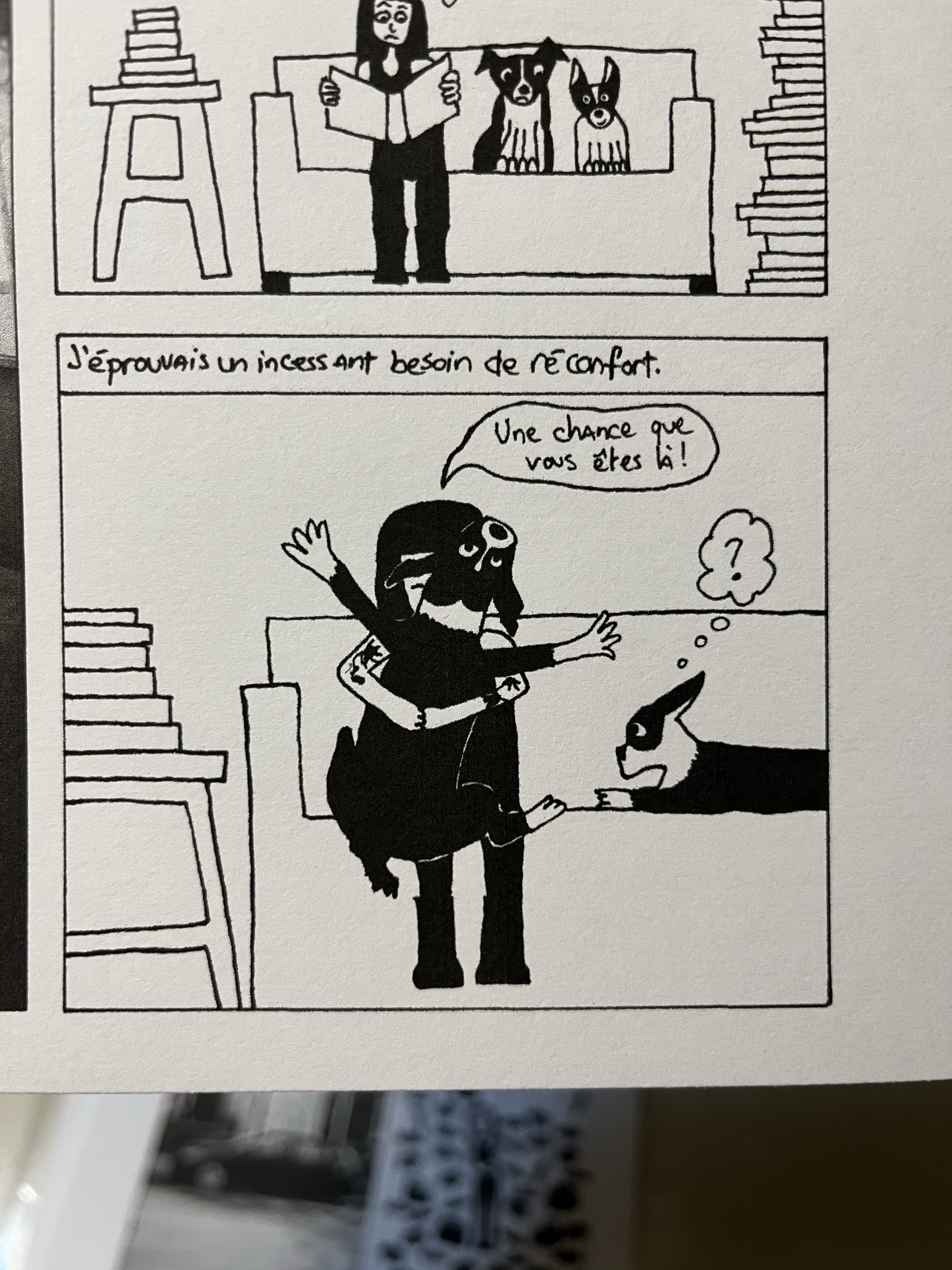 Les gens sont méchants parce qu’ils sont fragiles. Les gens sont méchants parce qu’ils sont frustrés. Les gens sont méchants parce qu’ils sont envieux. Les gens sont méchants parce qu’ils sont dans le déni et… cette histoire de me dire que mes bandes dessinées apprennent des choses sur mes chiens… au lieu de comprendre qu’elles sont des dénonciations de violences psychologiques, ça aurait impliqué pour lui de reconnaître qu’il commet lui-même très fréquemment les violences qui y sont dénoncées… et ça il est beaucoup trop faible pour faire ça.