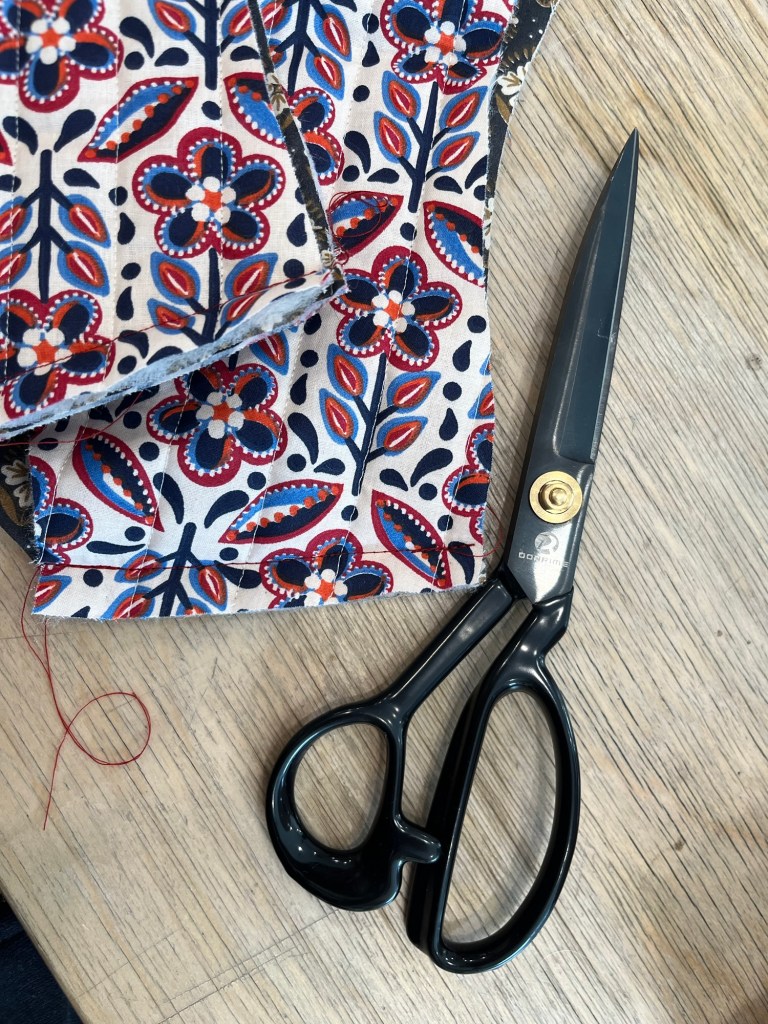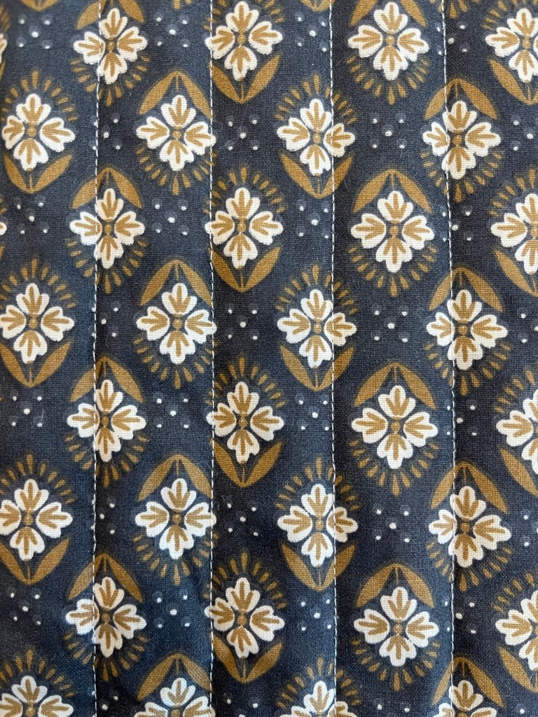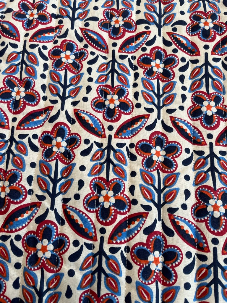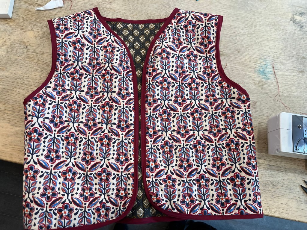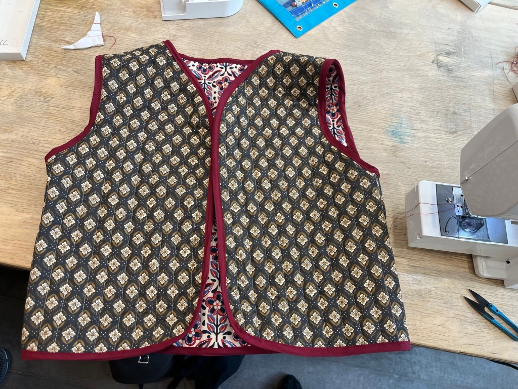 J’ai quand même eu une petite pause aujourd’hui. Je me suis acheté un patron pour me faire des mitaines avec une vache écossaise… et je suis allée fabriquer une veste matelassée. Je n’aurais pas choisi ce tissu, mais bon. À la fin je l’aime bien. Je vais chercher des compétences pour d’autres projets à venir.