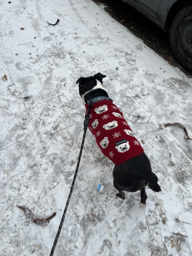 Mauvaise photo de Cassius dans la neige avec son pull d’ours polaire.