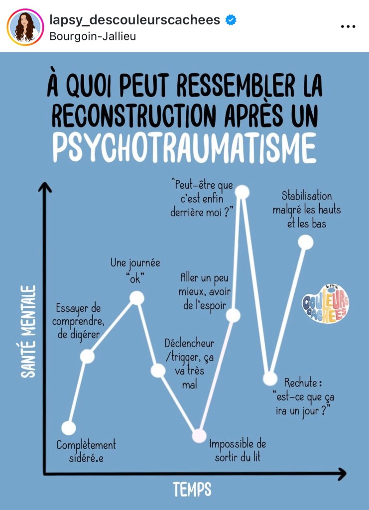 Chose certaine: beaucoup de gens ont des attentes irréalistes face à la vitesse à laquelle on peut se remettre d’un événement traumatique et à quel point on peut s’en remettre… encore plus s’il y en a plusieurs dans le cadre d’une vie comme pour moi. Ça ressemble un peu plus à ça qu’à une guérison totale et magique…