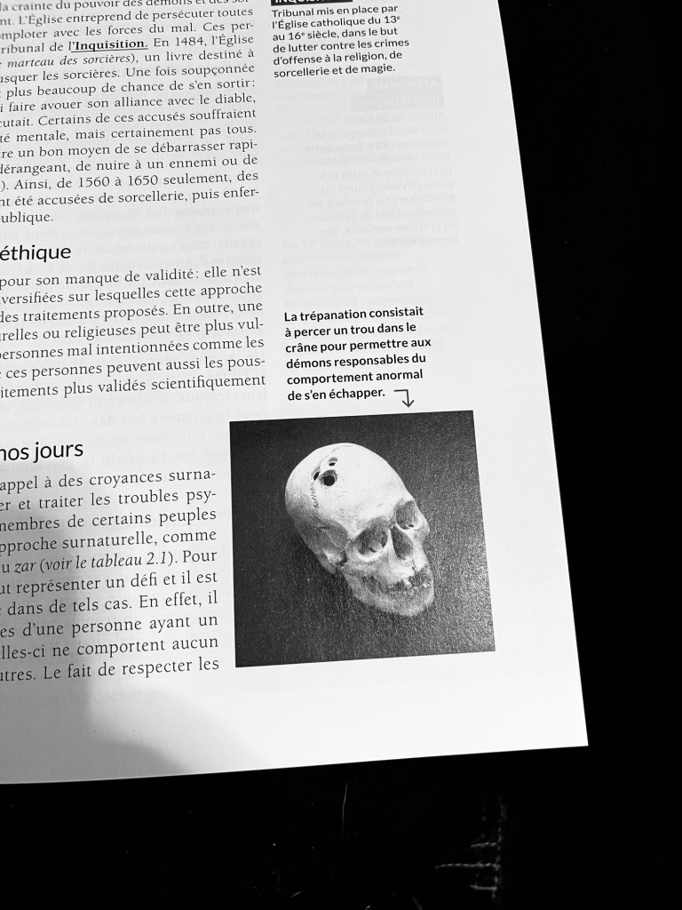 Mais oui… j’ai eu une genre de catharsis. J’ai eu une grosse crise de larmes l’autre soir… Je pense que bien des choses enfouies et le reste de stress sont partiellement sorties. Ça va mieux. Mieux que si j’avais eu une trépanation en tout cas. Non seulement certaines perçaient des trous dans le crâne, mais il y en avait qui se cachait des roches dans les poches et en montraient une à la personne ou ses proches pour montrer que le mal avait été retiré… Dans mon cas c’est plus abstrait… heureusement. Je continue aussi à retrouver de plus en plus mon énergie. Je dirais que j’en suis maintenant à 93% de mon énergie normale.