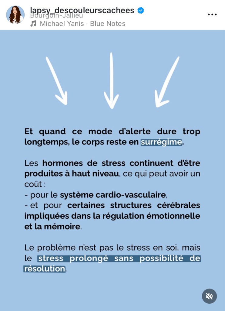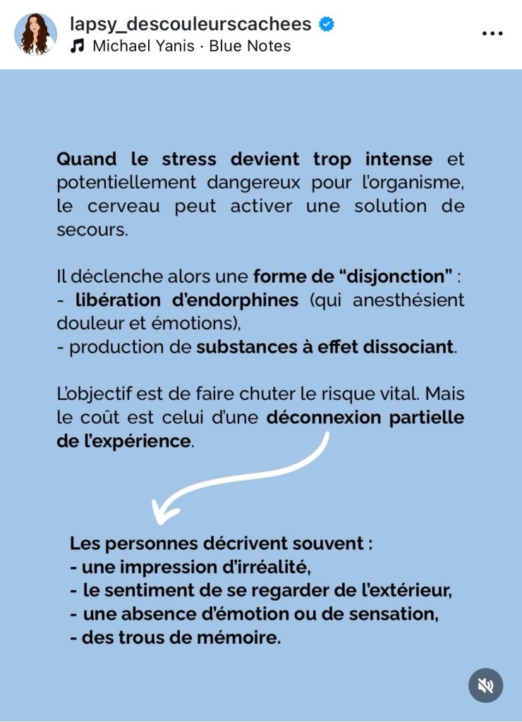 Je vais de l’avant d’ailleurs. Je ne me suis jamais laissée arrêtée par ce que j’ai vécu. J’ai utilisé toutes sortes de techniques pour aider mon cerveau à se rétablir. Ça ne se fait pas sur demande ni d’un seul coup. Ce que j’ai fait la dernière fois ça a réparé un peu d’un côté. Ne pas choisir l’évitement ou la fuite est bon pour moi. Par contre de l’autre côté il y a eu une absence de reconnaissance de mon état par cette femme qui a causé une autre blessure. ce n’est pas seulement la situation ou les paroles qui m’ont fait mal, mais le fait qu’elles sortent de la bouche d’une personne qui devrait mieux connaître ma vie et ma personnalité et qui a en théorie assez de connaissances pour savoir que ce qu’elle dit est faux… mais il y a peut-être une forme de mécanisme de défense de sa part. Je ne sais pas…