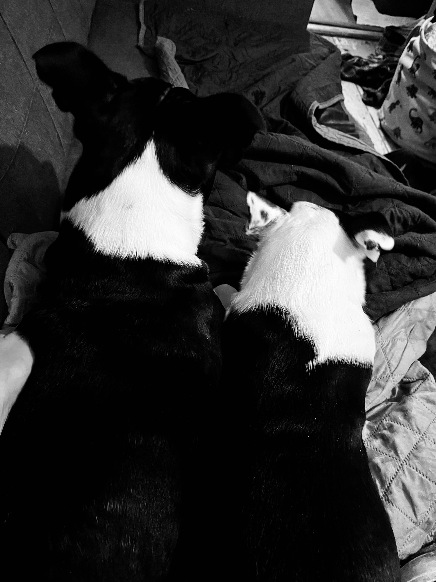 Ils restent bien collés sur moi, comme s’ils savaient. Je suis aussi très maternante avec les chiens. Surtout l’hiver. J’ai peur de trop baisser le chauffage et qu’ils aient froid. Heureusement ce n’est pas comme si j’étais partie des heures et des heures d’affilée. Mais quand même… je pense que j’ai une forme d’anxiété de séparation d’avec mes chiens. C’est ok. Il y a pire comme problème.