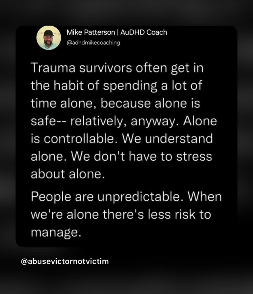 Comme j’ai déjà dit, c’est difficile dans mon cas de déterminer si à la base j’avais vraiment une personnalité plus introvertie ou si je préfére seulement la solitude et les animaux à cause de tout ce que j’ai vécu. Il reste que j’ai le droit de vouloir être seule sans que les gens imaginent n’importe quoi à mon sujet et me le projettent dessus violemment sans jamais avoir posé de question ni m’avoir écoutée si je leur en ai parlé.
